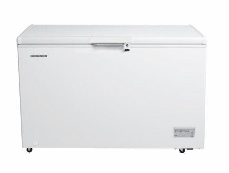 Chest freezer Heinner HCF-HM371CE++, energy efficiency class: E, total capacity: 371L, electronic control, resistance to low temperatures (operates at low temperatures - up to -15 ° C), resistance to voltage variations 175 ~ 255V, waterproof display, LED light, Super freezing function, 2 baskets, manual defrost, wheels for easy transport, freezing capacity: 18kg/24h, dimensions (WxDxH): 130 x 70.5 x 85 cm