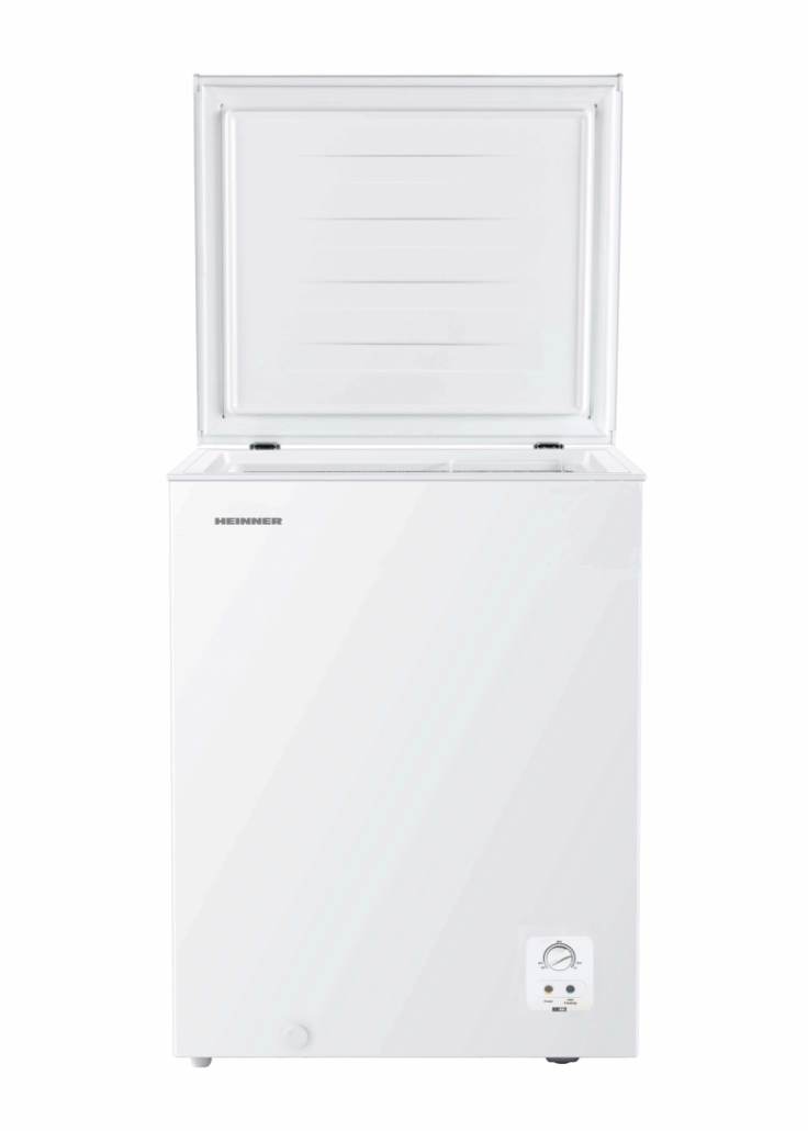 Chest freezer Heinner HCF-HS142E++, total capacity: 142L, energy efficiency class: E, electronic control with adjustable thermostat, Super freezing function, 1 wire basket, integrated handle, manual defrost, freezing capacity: 7kg/24h, dimensions (WxDxH): 62.5 × 55.9 × 85.4 cm, color: White