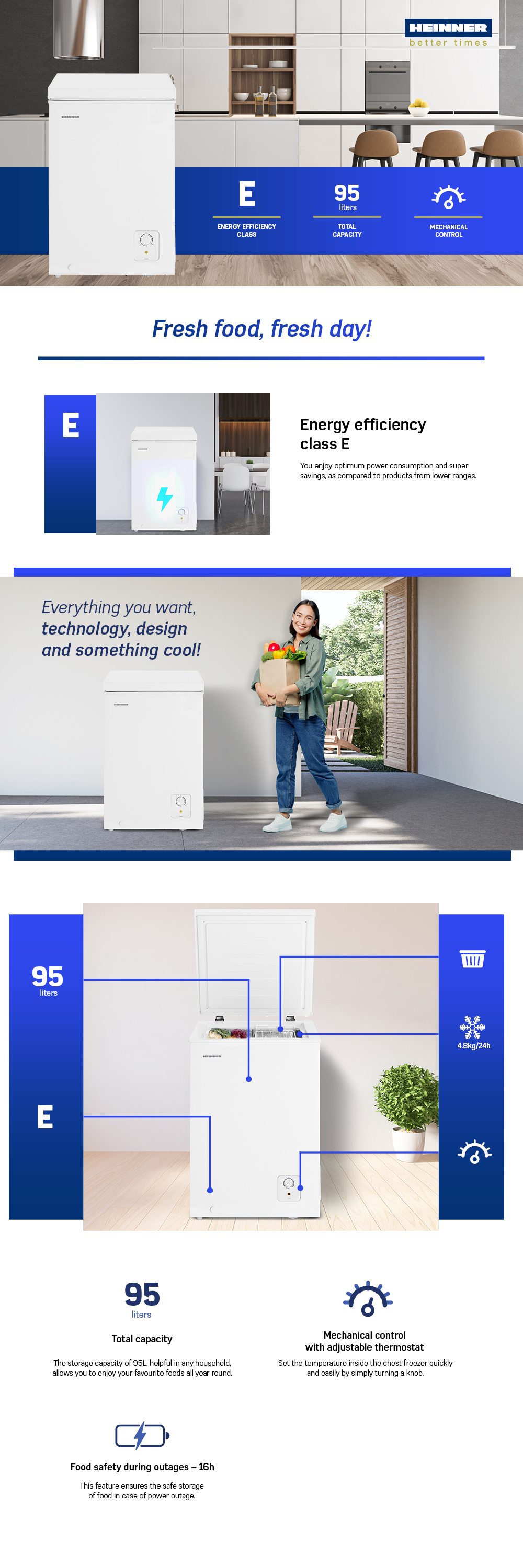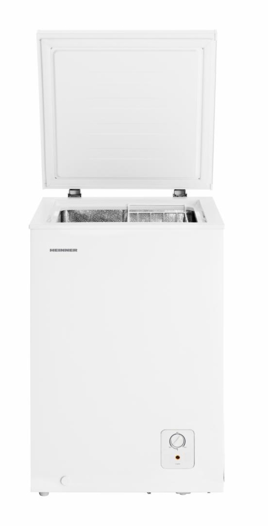 Chest freezer Heinner HCF-HS95E++, total capacity: 95L, energy efficiency class: E, mechanical control with adjustable thermostat, 1 wire basket, integrated handle, manual defrost, freezing capacity: 4.8kg/24h, dimensions (WxDxH): 54.6 × 47.9 × 85.4 cm, color: White