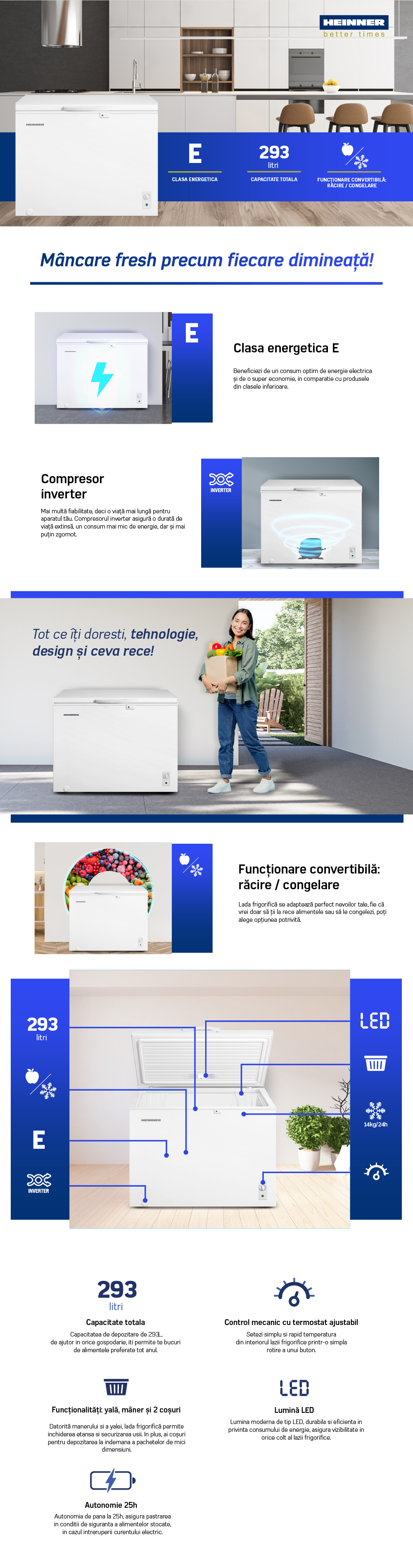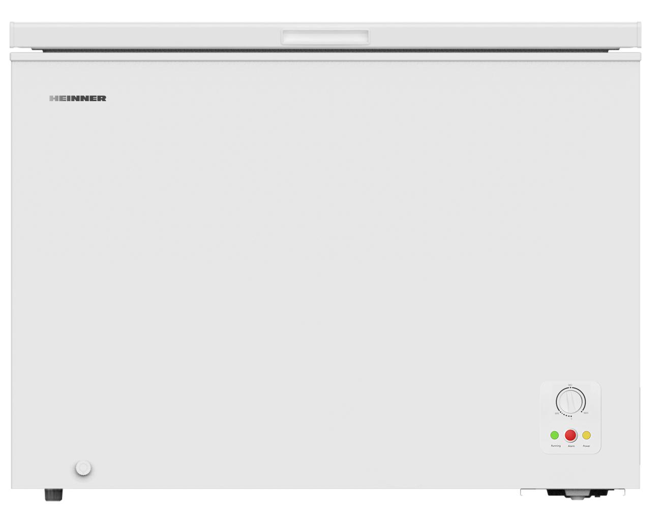 Chest freezer Heinner HCF-M293INVCE++, energy efficiency class: E, Inverter compressor, convertible (Fridge/Freezer), total capacity: 293L, mechanical control, resistance to low temperatures, LED light, 2 baskets, external handle with lock, manual defrost, freezing capacity: 14kg/24h, dimensions (WxDxH): 106.5 x 59.2 x 84.4 cm, color: White