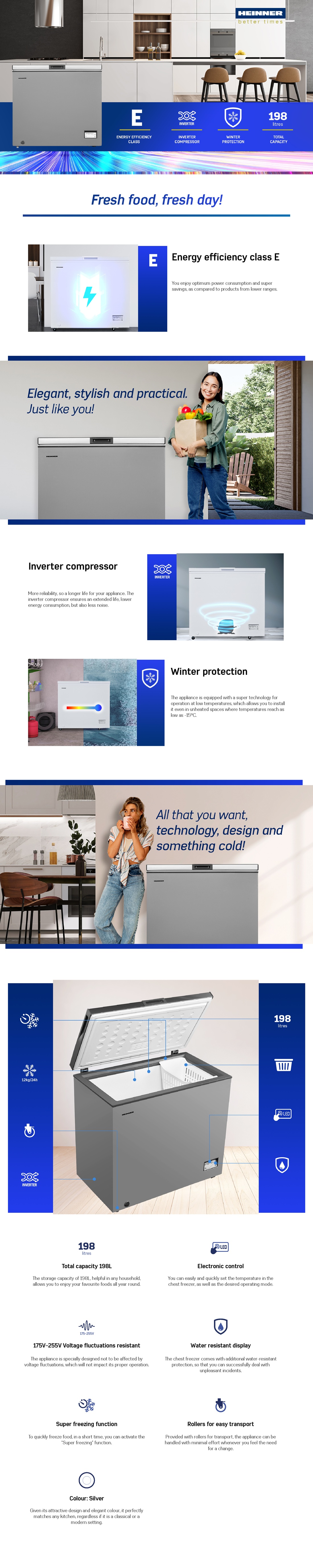 Chest freezer Heinner HCF-205NHSE++, energy efficiency class: E, total capacity: 198L, electronic control, resistance to low temperatures (operates at low temperatures - up to -15 ° C), resistance to voltage variations 175 ~ 255V, waterproof display, Fast freezing function, 1 plastic basket, manual defrost, wheels for easy transport, freezing capacity: 12kg/24h, dimensions (WxDxH): 90.5 x 54.5 x 84.5 cm, color: silver