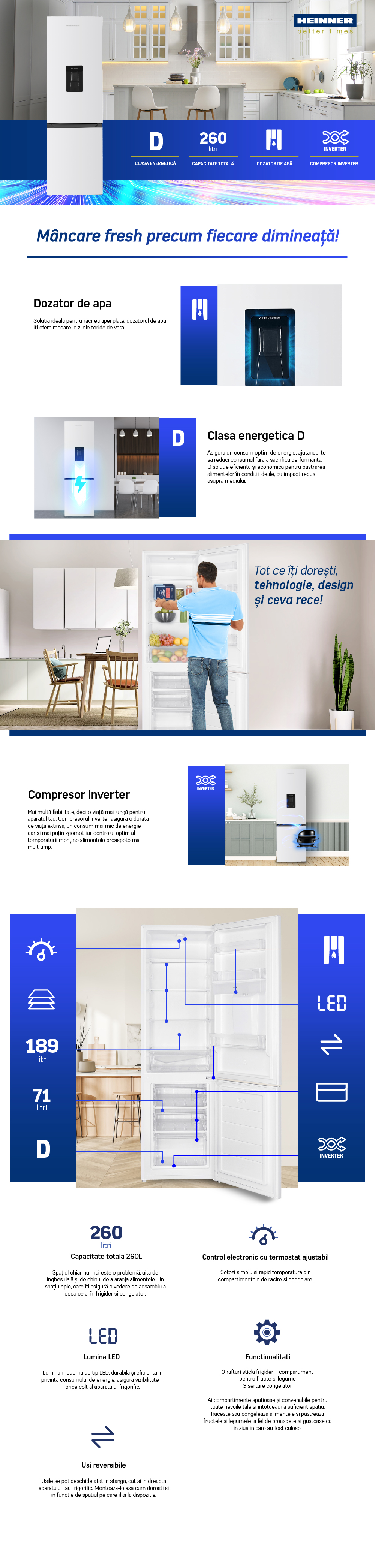 Combi fridge Heinner HC-HM260INVWDD,, energy efficiency class: D, Inverter compressor, water dispenser, total capacity: 260L, fridge capacity: 189L, freezer capacity: 71L, electronic control with adjustable thermostat, LED light, 3 fridge glass shelves, crisper drawer, 3 freezer drawers, reversible doors, egg tray, ice cube tray, freezing capacity: 3.2 kg/24h, dimensions (WxDxH): 55 x 56 x 180 cm, color: White