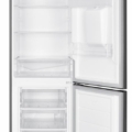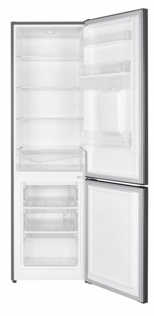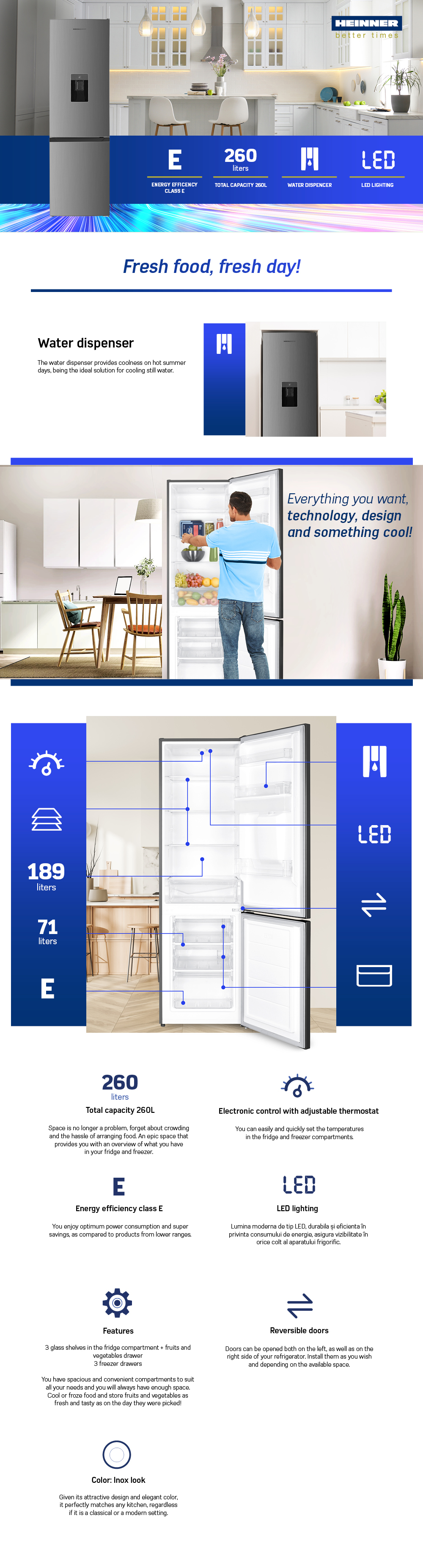 Combi fridge Heinner HC-HM260XWDE++, energy efficiency class: E, total capacity: 260L, fridge capacity: 189L, freezer capacity: 71L, electronic control with adjustable thermostat, water dispenser, LED light, 3 fridge glass shelves, crisper drawer, 3 freezer drawers, reversible doors, egg tray, ice cubes tray, freezing capacity: 3.2kg/24h, dimensions (WxDxH): 55 x 56 x 180 cm, color: Inox look