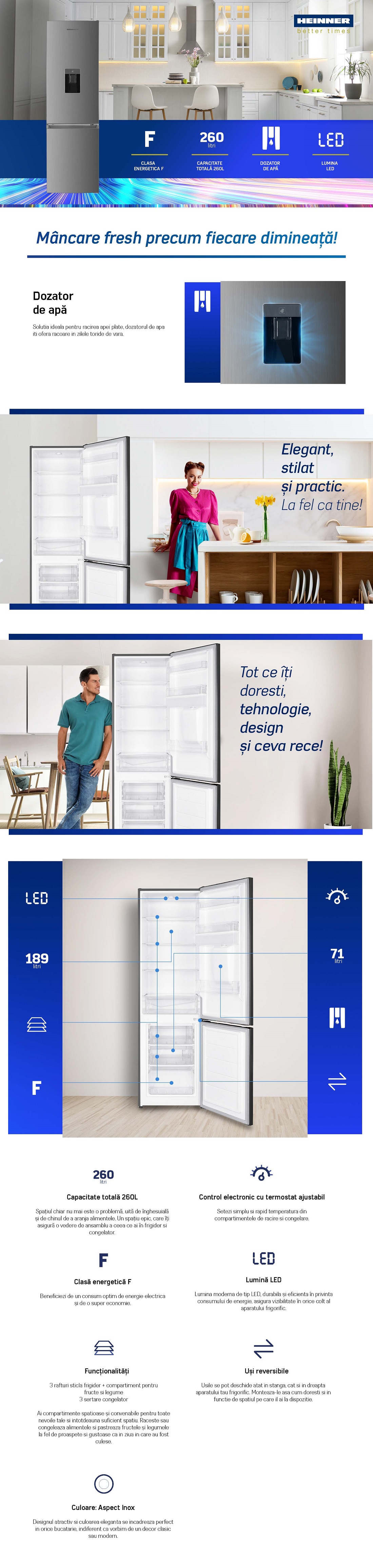 Combi fridge Heinner HC-HM260XWDF+, energy efficiency class: F, total capacity: 260L, fridge capacity: 189L, freezer capacity: 71L, electronic control with adjustable thermostat, water dispenser, LED light, 3 fridge glass shelves, crisper drawer, 3 freezer drawers, reversible doors, egg tray, ice cubes tray, freezing capacity: 3.2kg/24h, dimensions (WxDxH): 55 x 56 x 180 cm, color: Inox look