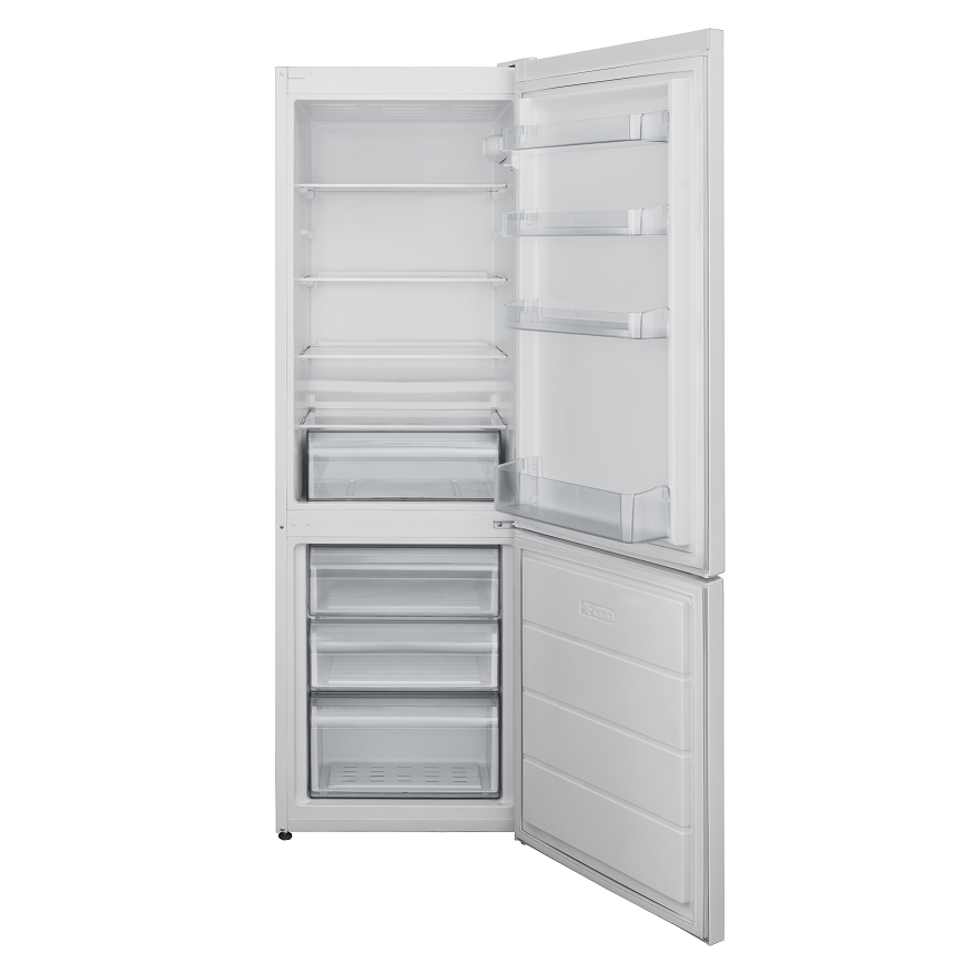 Combi fridge freezer Heinner HC-V268E++, Energy efficiency class: E, Less Frost cooling system, Total capacity: 268L, Fridge capacity: 184L, Freezer capacity: 84L, Mechanical control with adjustable thermostat, LED light, Super freezing, 3 fridge glass shelves, 3 freezer drawers, 1 compartment for fruits and vegetables, Egg tray, Ice cube tray, Cooling capacity: 3.9kg/24h, Dimensions (WxDxH): 54 x 59.5 x 170 cm, Colour: White
