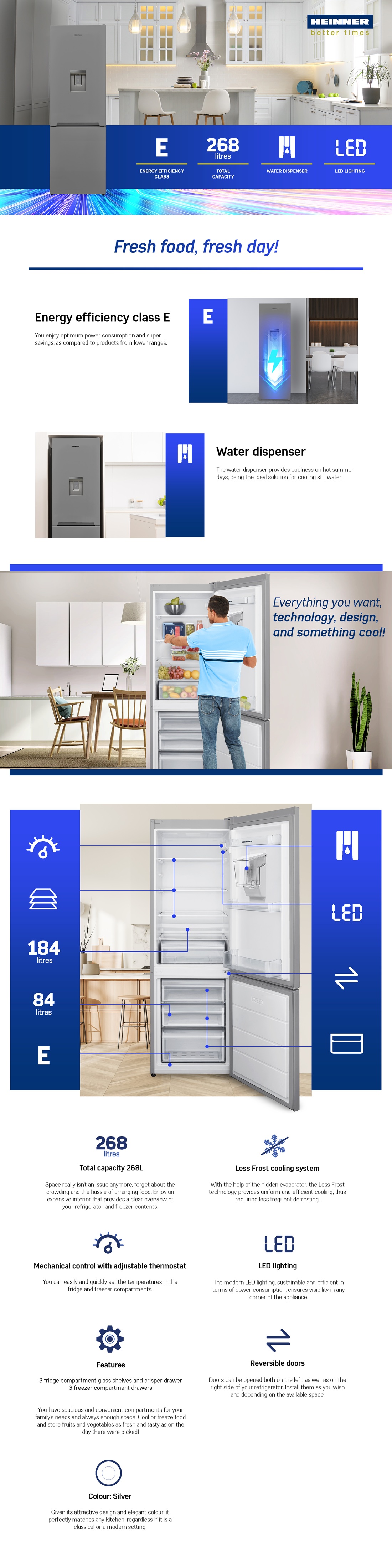 Combi fridge Heinner HC-V2701SWDE++, energy efficiency class: E, total capacity: 268L, fridge capacity: 184, freezer capacity: 84L, mechanical control with adjustable thermostat, LED light, Super freezing function, 3 fridge glass shelves, 3 freezer drawers, compartment for fruits and vegetables, water dispenser, dimensions (WxDxH): 54 x 59.5 x 170 cm, silver