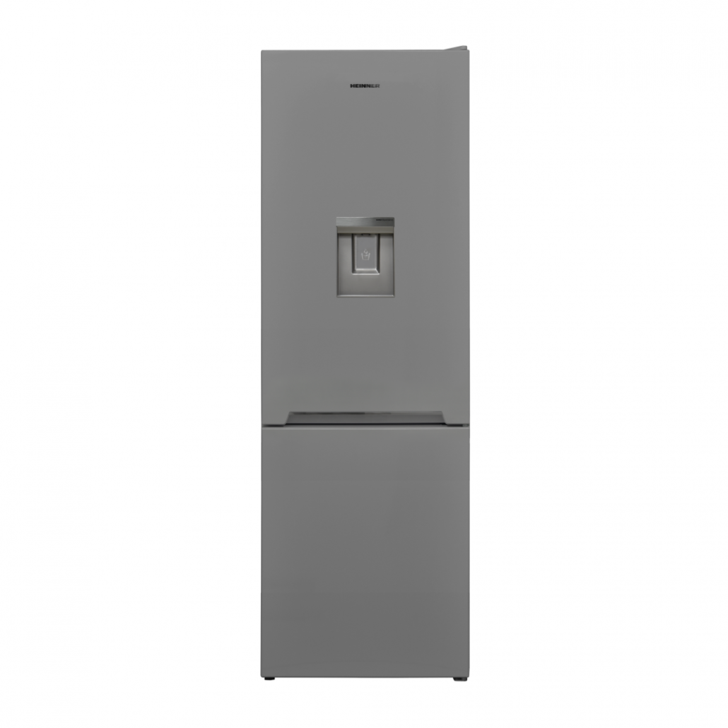 Combi fridge Heinner HC-V2701SWDE++, energy efficiency class: E, total capacity: 268L, fridge capacity: 184, freezer capacity: 84L, mechanical control with adjustable thermostat, LED light, Super freezing function, 3 fridge glass shelves, 3 freezer drawers, compartment for fruits and vegetables, water dispenser, dimensions (WxDxH): 54 x 59.5 x 170 cm, silver