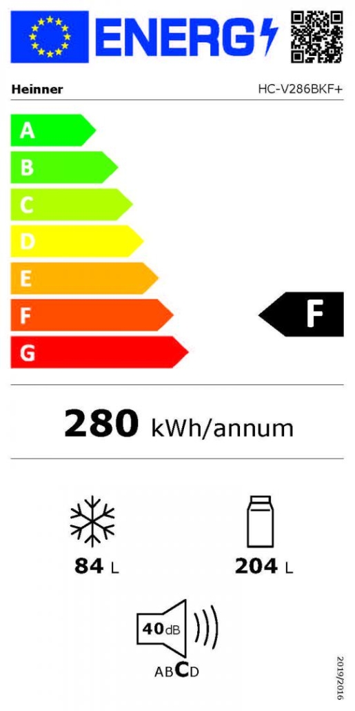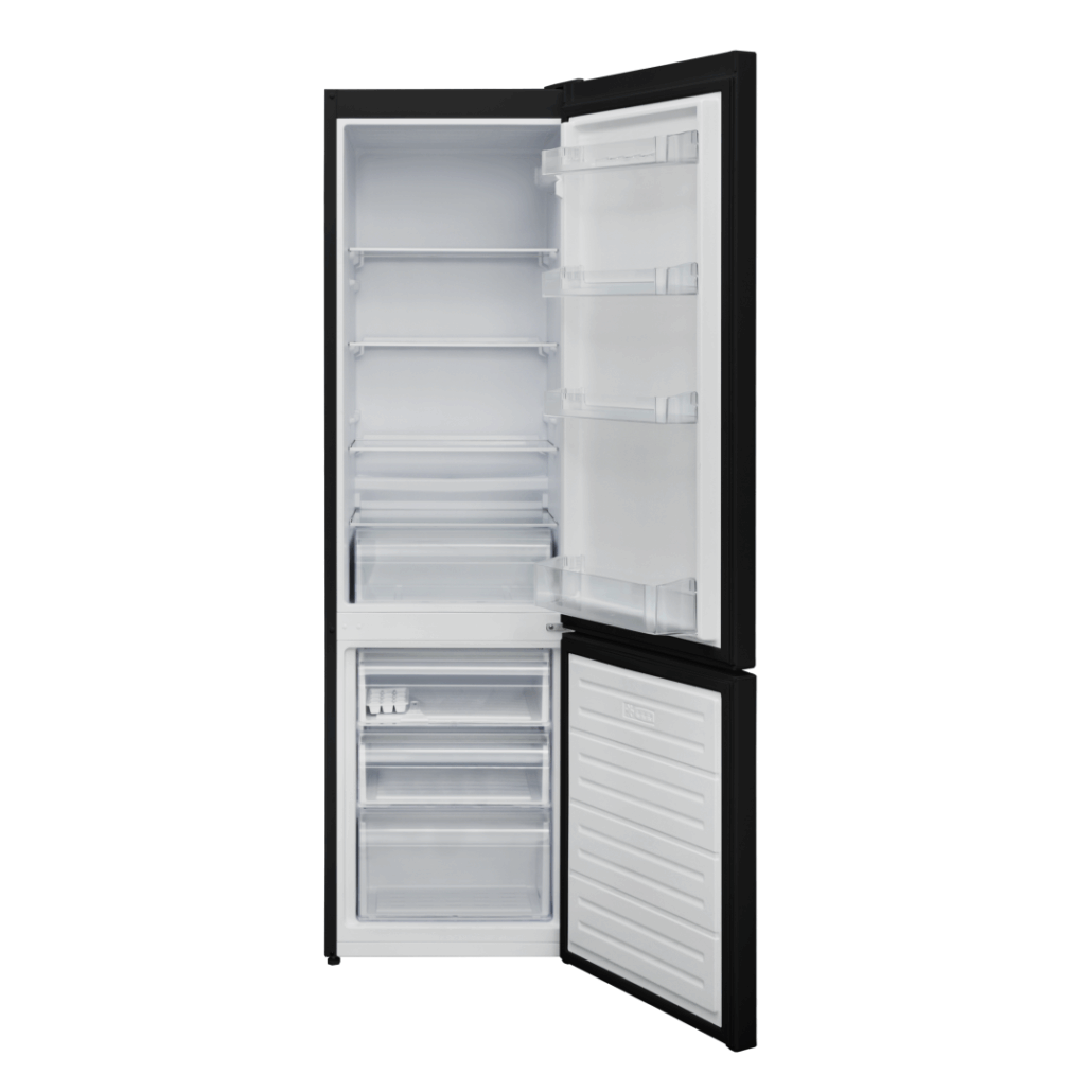 Combi fridge HC-V286BKF+, Energy efficiency class: F, Less Frost cooling system, Total capacity: 288L, Fridge capacity: 204L, Freezer capacity: 84L, Mechanical control with adjustable thermostat, LED light, Super freezing, 3 fridge glass shelves, 3 freezer drawers, Compartment for fruits and vegetables, Reversible doors, Egg tray, Ice cube tray, Freezing capacity: 3.9kg/24h, Dimensions (WxDxH): 54 x 59.5 x 180 cm, black with silver strip decoration on handle