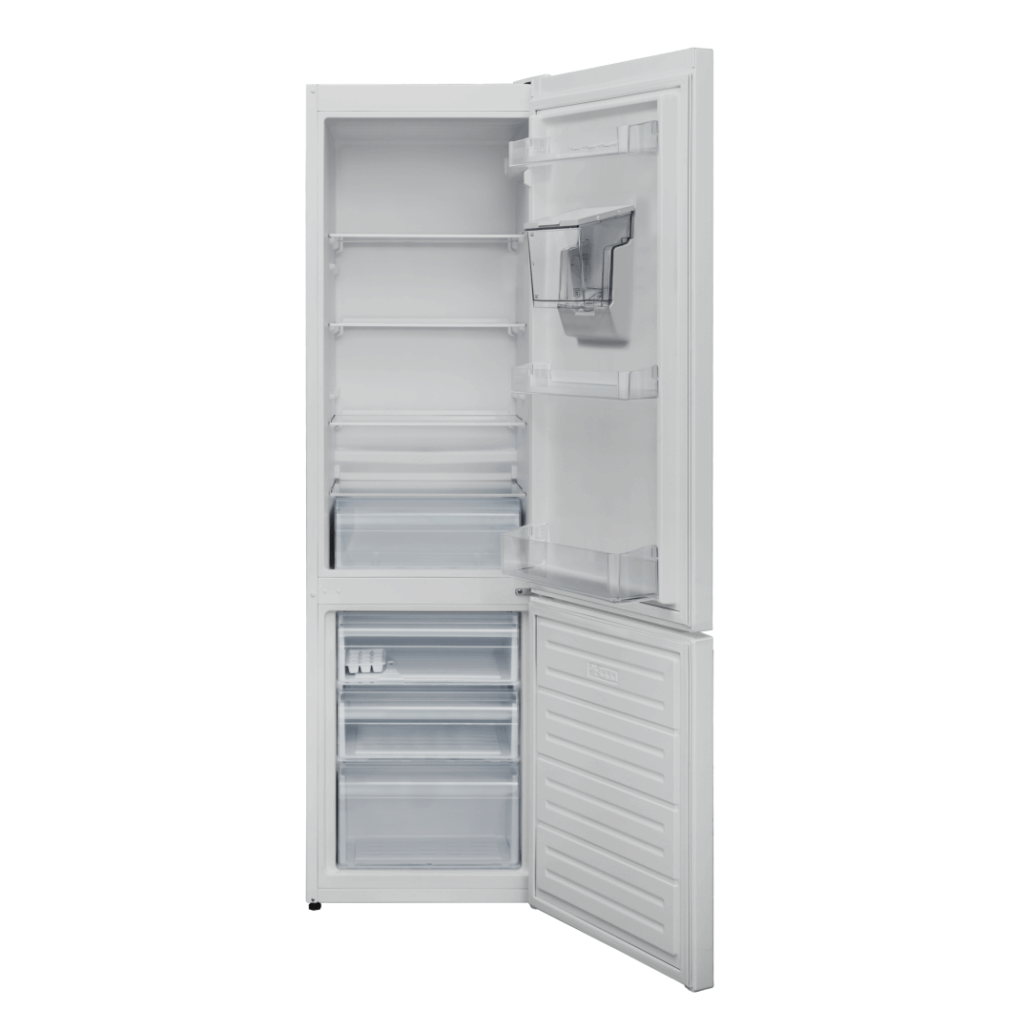 Combi fridge HC-V286WDF+, Energy efficiency class: F, Less Frost cooling system, Water Dispenser, Total capacity: 288L, Fridge capacity: 204L, Freezer capacity: 84L, Mechanical control with adjustable thermostat, LED light, Super freezing, 3 fridge glass shelves, 3 freezer drawers, Compartment for fruits and vegetables, Reversible doors, Egg tray, Ice cube tray, Freezing capacity: 3.9kg/24h, Dimensions (WxDxH): 54 x 59.5 x 180 cm, White with silver strip decoration on handle