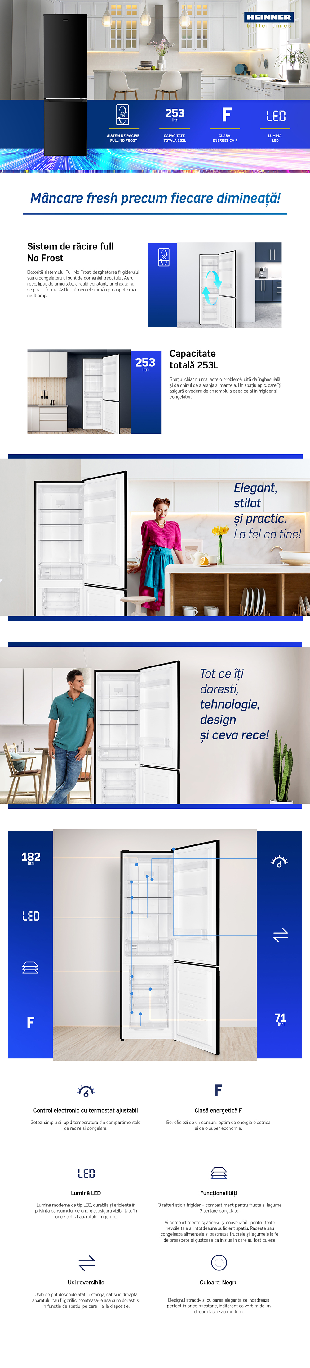 Combi fridge Heinner HCNF-HM253BKF+, No Frost, energy efficiency class F, total caapcity: 253L, fridge capacity: 182L, freezer capacity: 71L, electronic control with adjustable thermostat, LED light, 3 fridge glass shelves, crisper drawer, 3 freezer drawers, egg tray, ice cube tray, freezing capacity: 3.2kg/24h, dimensions (WxDxH): 54 x 60 x 180 cm, color: Black