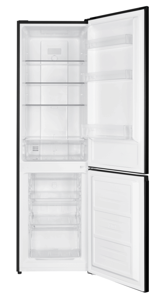 Combi fridge Heinner HCNF-HM253BKF+, No Frost, energy efficiency class F, total caapcity: 253L, fridge capacity: 182L, freezer capacity: 71L, electronic control with adjustable thermostat, LED light, 3 fridge glass shelves, crisper drawer, 3 freezer drawers, egg tray, ice cube tray, freezing capacity: 3.2kg/24h, dimensions (WxDxH): 54 x 60 x 180 cm, color: Black