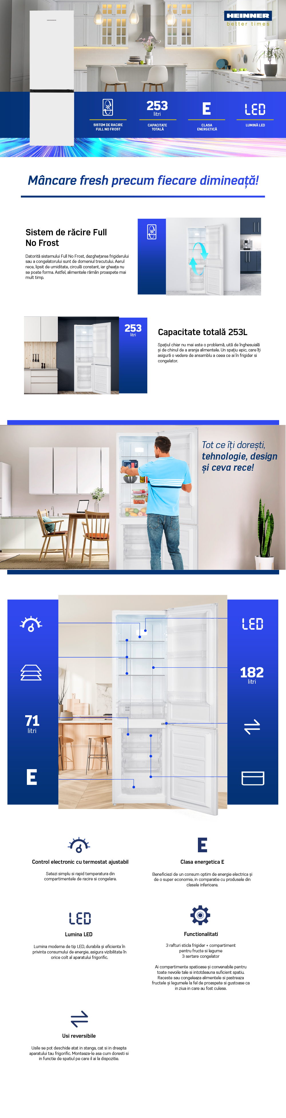 Combi fridge Heinner HCNF-HM253E++, No Frost, energy efficiency class: E, total capacity: 253 L, refrigerator capacity: 182 L, freezer capacity: 71 L, electronical control with adjustable thermostat, LED light, 3 fridge glass shelves, fruits and vegetables compartment, 3 freezer drawers, reversible doors, egg tray, ice cube tray, freezing capacity: 3.2kg/24h, dimensions (WxDxH): 54 x 60 x 180 cm, color: White