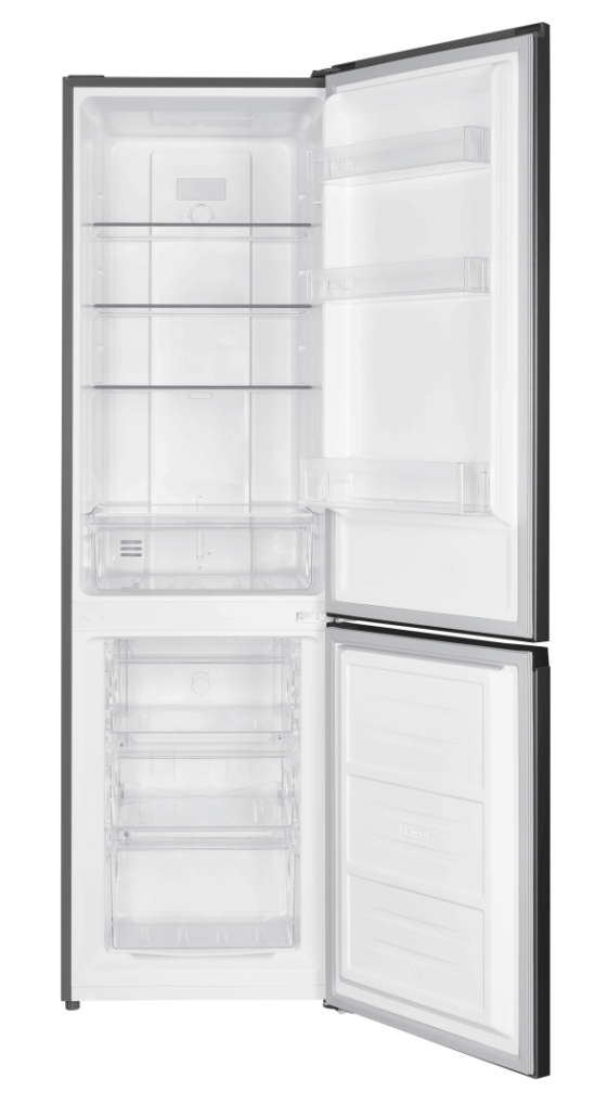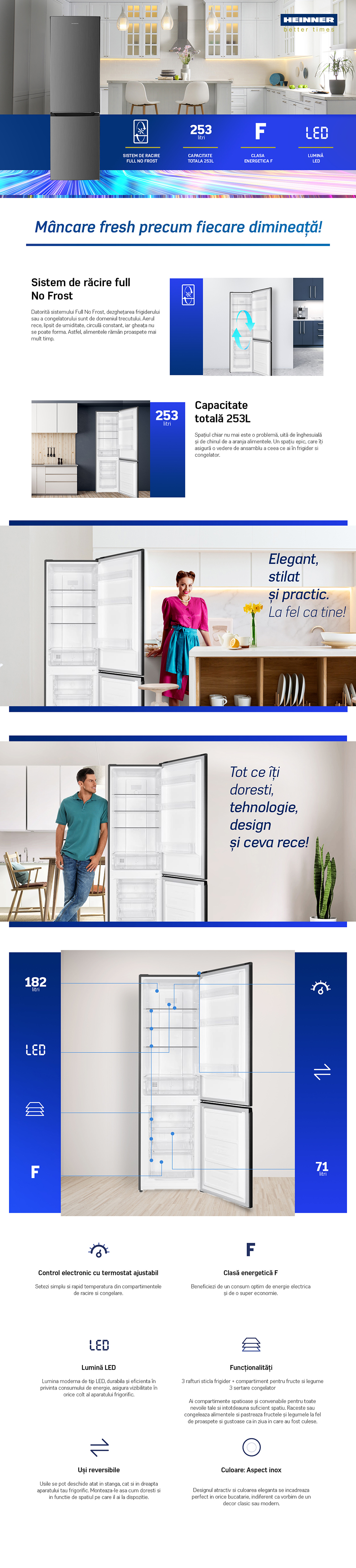 Combi fridge Heinner HCNF-HM253XF+, No Frost, energy efficiency class F, total capacity: 253L, fridge capacity: 182L, freezer capacity: 71L, electronic control with adjustable thermostat, LED light, 3 fridge glass shelves, crisper drawer, 3 freezer drawers, egg tray, ice cube tray, freezing capacity: 3.2kg/24h, dimensions (WxDxH): 54 x 60 x 180 cm, color: Inox look