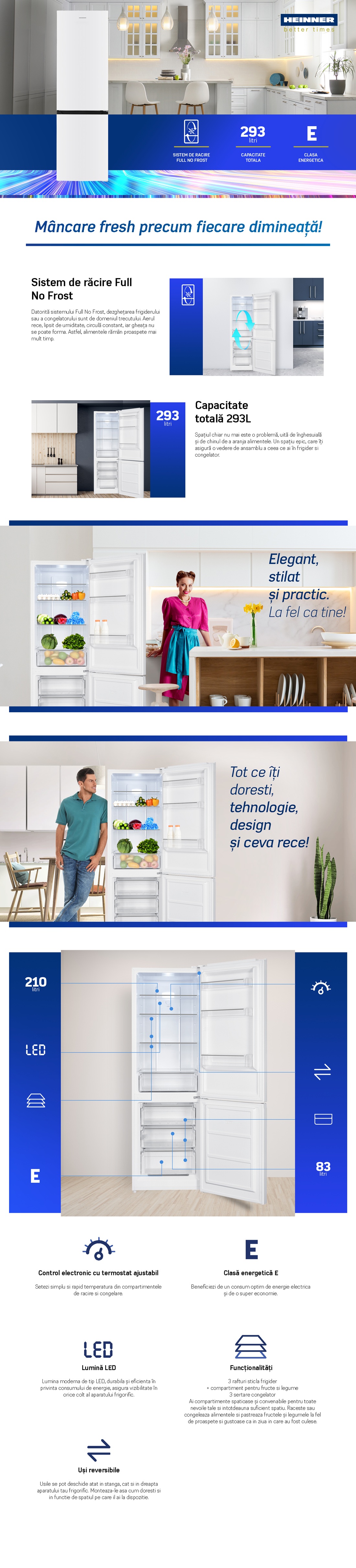 Combi fridge Heinner HCNF-HM293E++, No Frost, energy efficiency class: E, total capacity: 293 L, refrigerator capacity: 210 L, freezer capacity: 83 L, electronical control with adjustable thermostat, LED light, 3 fridge glass shelves, fruits and vegetables compartment, 3 freezer drawers, reversible doors, egg tray, ice cube tray, freezing capacity: 3.8kg/24h, dimensions (WxDxH): 60 x 60 x 186 cm, color: White