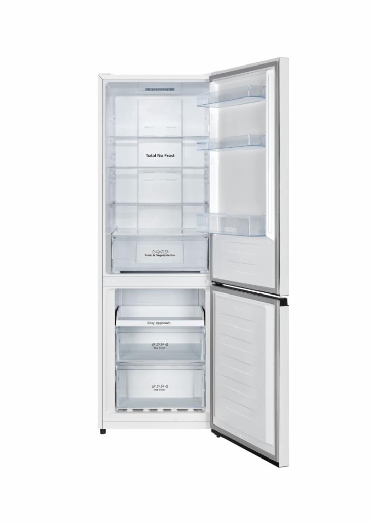 Combi fridge Heinner HCNF-HS292E++, Full No Frost, Multi Air-Flow System, energy efficiency class: E, total capacity: 292 L, refrigerator capacity: 207 L, freezer capacity: 85 L, electronical control with inside display, Holiday function, Super freezing function, 3 fridge glass shelves, fruits and vegetables compartment, 2 drawers + 1 pizza tray in the freezer, LED light, egg tray, ice cube tray, freezing capacity: 5kg/24h, dimensions (WxDxH): 59.5 x 59 x 178.5cm, color: White with black handle