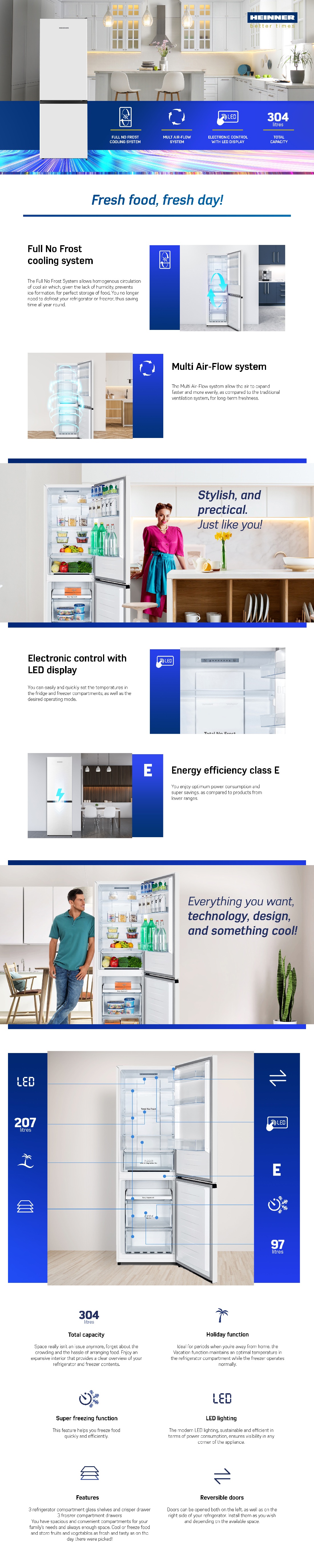 Combi fridge Heinner HCNF-HS304E++, Full No Frost, Multi Air-Flow system, energy efficiency class: E, total capacity: 304 L, refrigerator capacity: 207 L, freezer capacity: 97 L, electronical control with LED display, Holiday function, Super freezing function, LED light, 3 fridge glass shelves, 1 compartment for fruits and vegetables, 3 freezer compartments, freezing capacity: 6kg/24h, dimensions (WxDxH): 59.5 x 59 x 186 cm, color: White with black handle