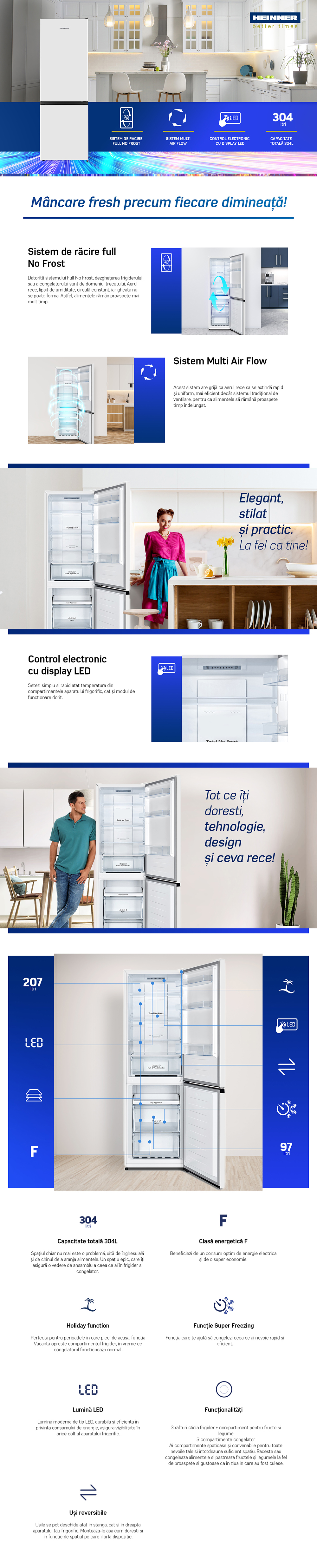 Combi fridge Heinner HCNF-HS304F+, No Frost, Multi Air Flow system, energy efficiency class F, total capacity: 304L, fridge capacity: 207L, freezer capacity: 97L, electronic control with inside display, Holiday function, Super freezing function, LED light, 3 fridge glass shelves, crisper drawer, 2 drawers + pizza tray in the freezer, egg tray, ice cube tray, freezing capacity: 6 kg/24h, dimensions (WxDxH): 59.5 x 59 x 186 cm, color: White with black handle