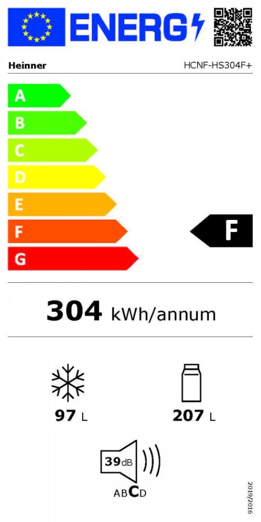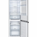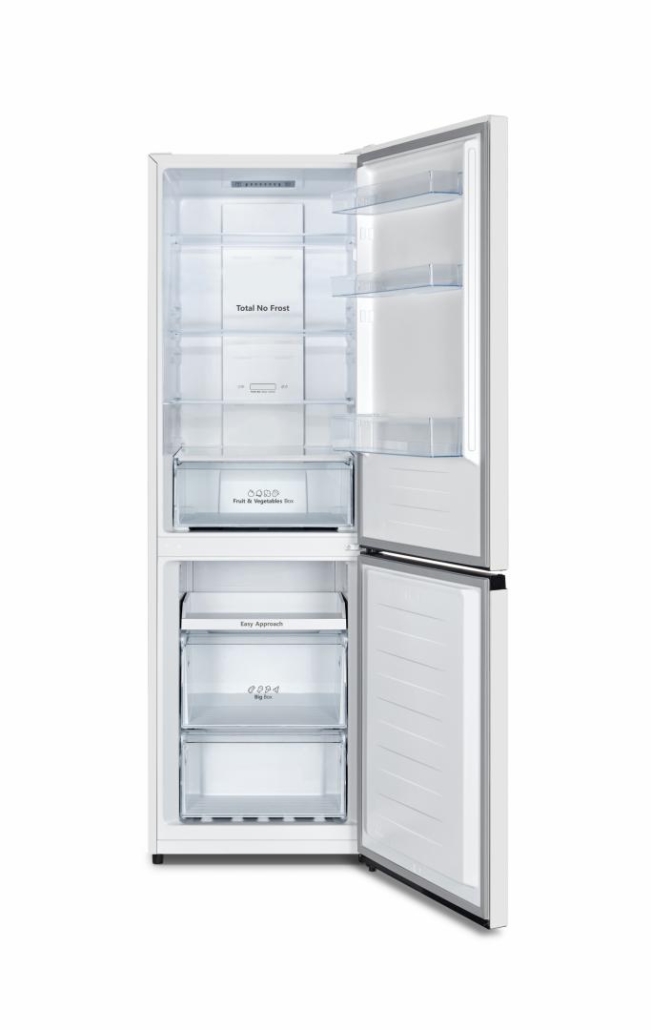 Combi fridge Heinner HCNF-HS304F+, No Frost, Multi Air Flow system, energy efficiency class F, total capacity: 304L, fridge capacity: 207L, freezer capacity: 97L, electronic control with inside display, Holiday function, Super freezing function, LED light, 3 fridge glass shelves, crisper drawer, 2 drawers + pizza tray in the freezer, egg tray, ice cube tray, freezing capacity: 6 kg/24h, dimensions (WxDxH): 59.5 x 59 x 186 cm, color: White with black handle