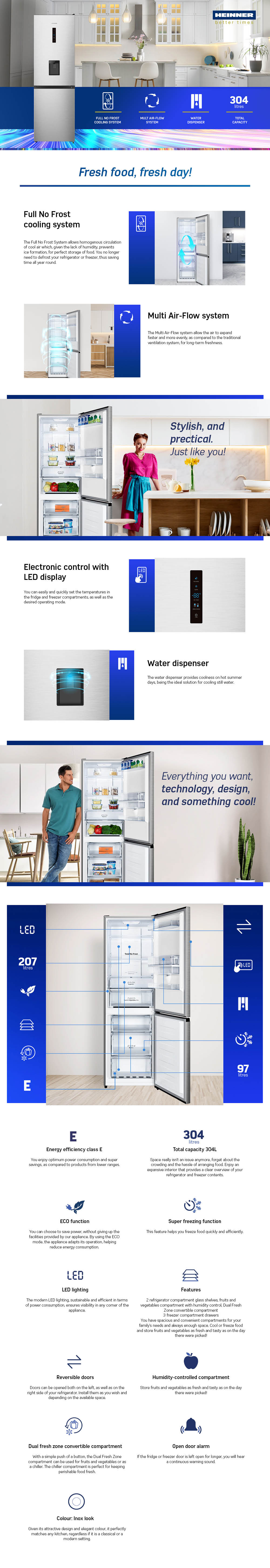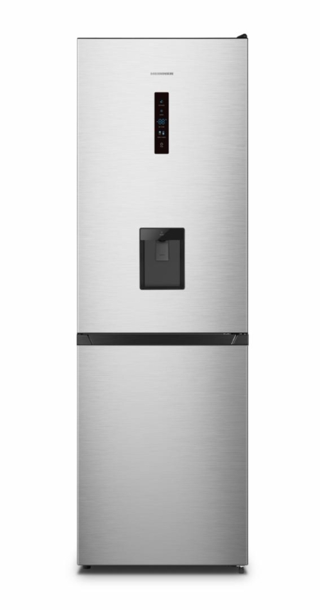Combi fridge Heinner HCNF-HS304XWDE++, Full No Frost, Multi Air-Flow system, water dispenser, energy efficiency class: E, total capacity: 304 L, refrigerator capacity: 207 L, freezer capacity: 97 L, electronical control with LED display and touch control, ECO function, Super freezing function, Dual Fresh Zone convertible compartment, LED light, 3 fridge glass shelves, 1 compartment for fruits and vegetables, 3 freezer compartments, freezing capacity: 6kg/24h, dimensions (WxDxH): 59.5 x 59 x 186 cm, color: Inox look