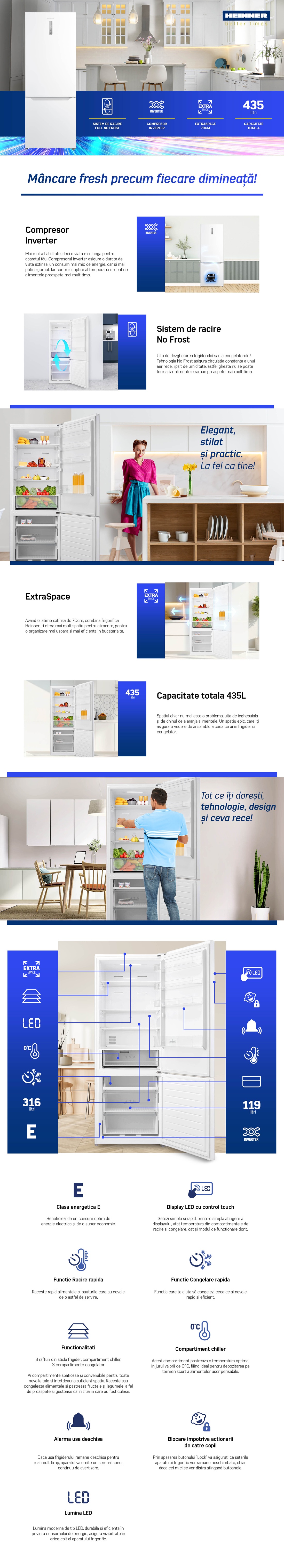 Combi fridge Heinner HCNF-M435INVE++, No Frost,, energy efficiency class: E, Inverter compressor, total capacity: 435 L, refrigerator capacity: 316 L, freezer capacity: 119 L, LED display with touch control, ExtraSpace –70cm width, Super cooling function, Super freezing function, open door alarm, child lock, LED light, chiller drawer, 3 fridge glass shelves, 2 freezer drawers + Pizza tray, reversible doors, freezing capacity: 9kg/24h, dimensions(WxDxH): 70 x 66.6 x 188 cm, color: White
