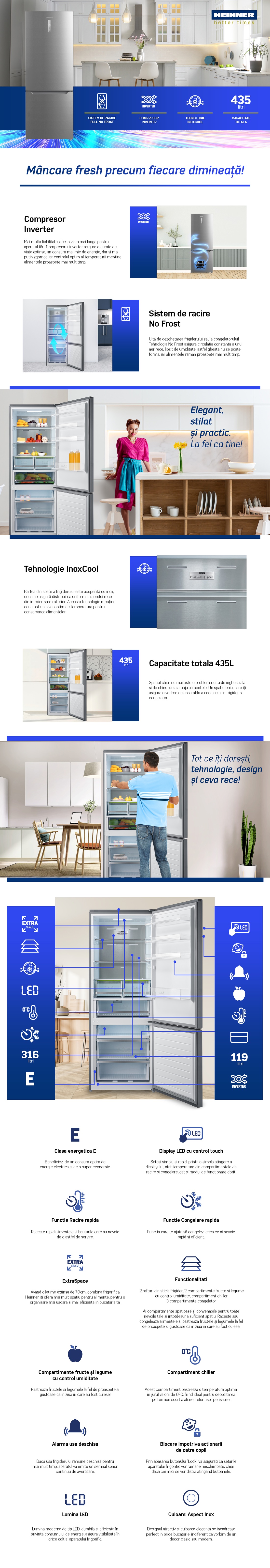 Combi fridge Heinner HCNF-M435INVHXE++, No Frost, Inverter compressor, energy efficiency class: E, total capacity: 435 L, refrigerator capacity: 316 L, freezer capacity: 119 L, LED display with touch control, InoxCool technology, ExtraSpace –70cm width, Super cooling function, Super freezing function, open door alarm, child lock, LED light, chiller compartment, 2 crisper drawers with humidity control, 2 fridge glass shelves, 2 freezer drawers + Pizza tray, reversible doors, freezing capacity: 9kg/24h, dimensions (WxDxH): 70 x 66.6 x 188 cm, color: Inox look