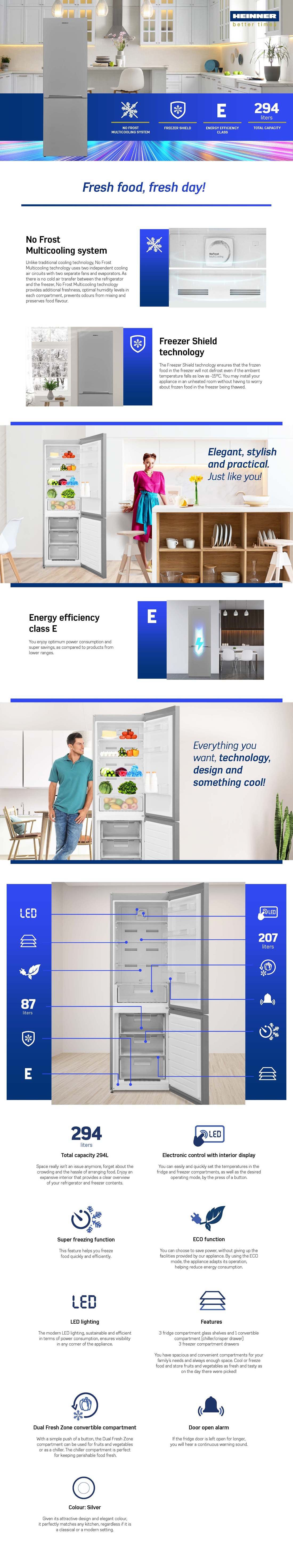 Combi fridge Heinner HCNF-V291SE++, No Frost Multicooling, energy efficiency class: E, total capacity: 294 L, refrigerator capacity: 207 L, freezer capacity: 77 L, electronical control with internal display, Freezer Shield technology (operates at low temperatures, up to -15°C), LED light, ECO Function, Super freezing function, open door alarm, 3 fridge glass shelves, 1 convertible compartment (chiller/crisper), 3 freezer drawers, egg tray, ice cube tray, freezing capacity: 5 kg/24h, dimensions (WxDxH): 59.5 x 60 x 186cm, color: silver with silver strip decoration on handle