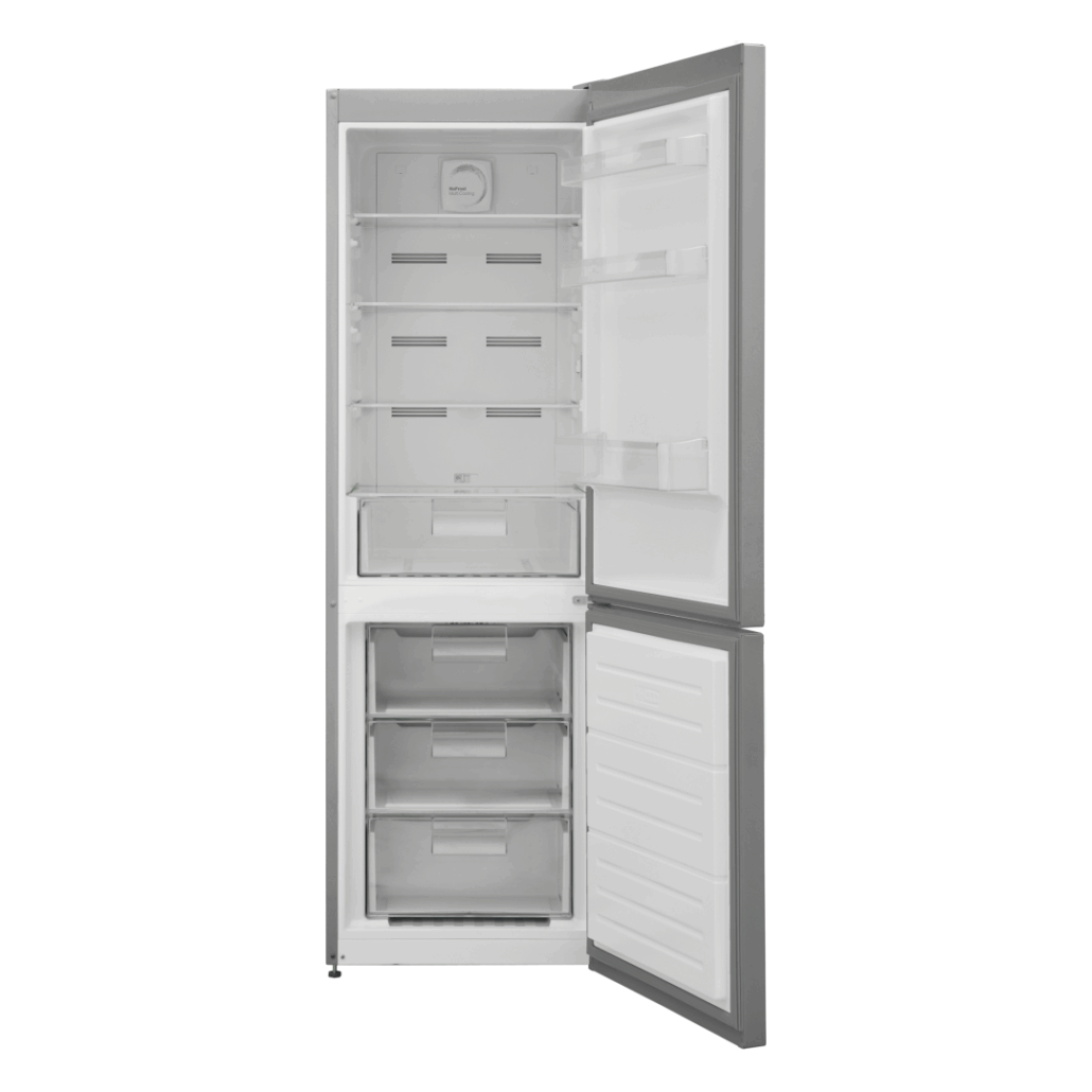 Combi fridge Heinner HCNF-V291SE++, No Frost Multicooling, energy efficiency class: E, total capacity: 294 L, refrigerator capacity: 207 L, freezer capacity: 77 L, electronical control with internal display, Freezer Shield technology (operates at low temperatures, up to -15°C), LED light, ECO Function, Super freezing function, open door alarm, 3 fridge glass shelves, 1 convertible compartment (chiller/crisper), 3 freezer drawers, egg tray, ice cube tray, freezing capacity: 5 kg/24h, dimensions (WxDxH): 59.5 x 60 x 186cm, color: silver with silver strip decoration on handle