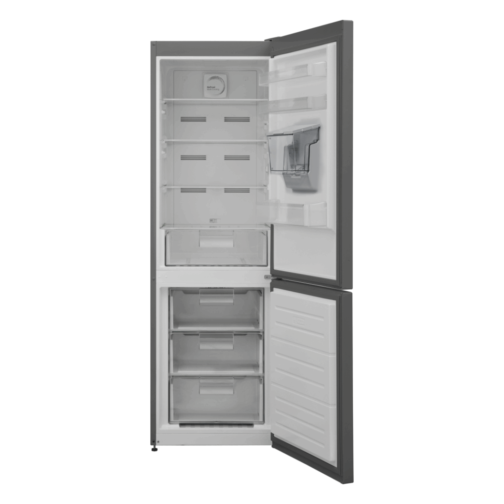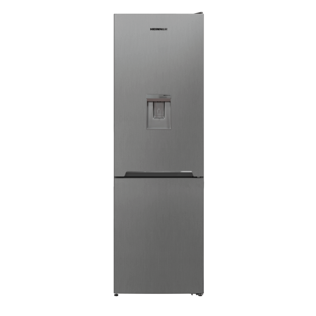 Combi fridge Heinner HCNF-V291XWDE++, No Frost Multicooling, water dispenser, energy efficiency class: E, total capacity: 294 L, refrigerator capacity: 207 L, freezer capacity: 77 L, electronical control with internal display, Freezer Shield technology, LED light, ECO Function, Super freezing function, open door alarm, 3 fridge glass shelves, 1 convertible compartment (chiller/crisper), 3 freezer drawers, egg tray, ice cube tray, freezing capacity: 5 kg/24h, dimensions (WxDxH): 59.5 x 60 x 186cm, color: Inox look with chromed strip decoration on handle