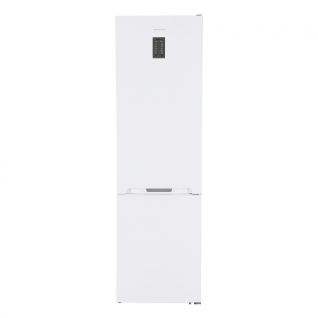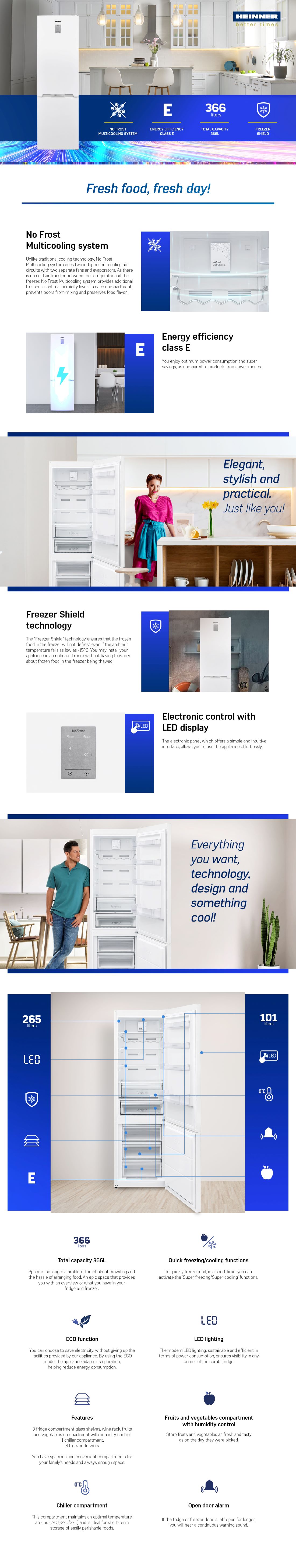 Combi fridge Heinner HCNF-V366E++, No Frost Multicooling, energy efficiency class: E, total capacity: 366 L, fridge capacity: 265 L, freezer capacity: 101 L, display on door, electronic control, Freezer Shield technology, LED light, Super freezing function, open door alarm, Chiller drawer, crisper drawer with humidity control, 3 fridge glass shelves, 3 freezer drawers, egg tray, ice cube tray, freezing capacity: 8kg/24h, dimensions (WxDxH): 59.5 x 65 x 201cm, color: white with chromed strip decoration on handle