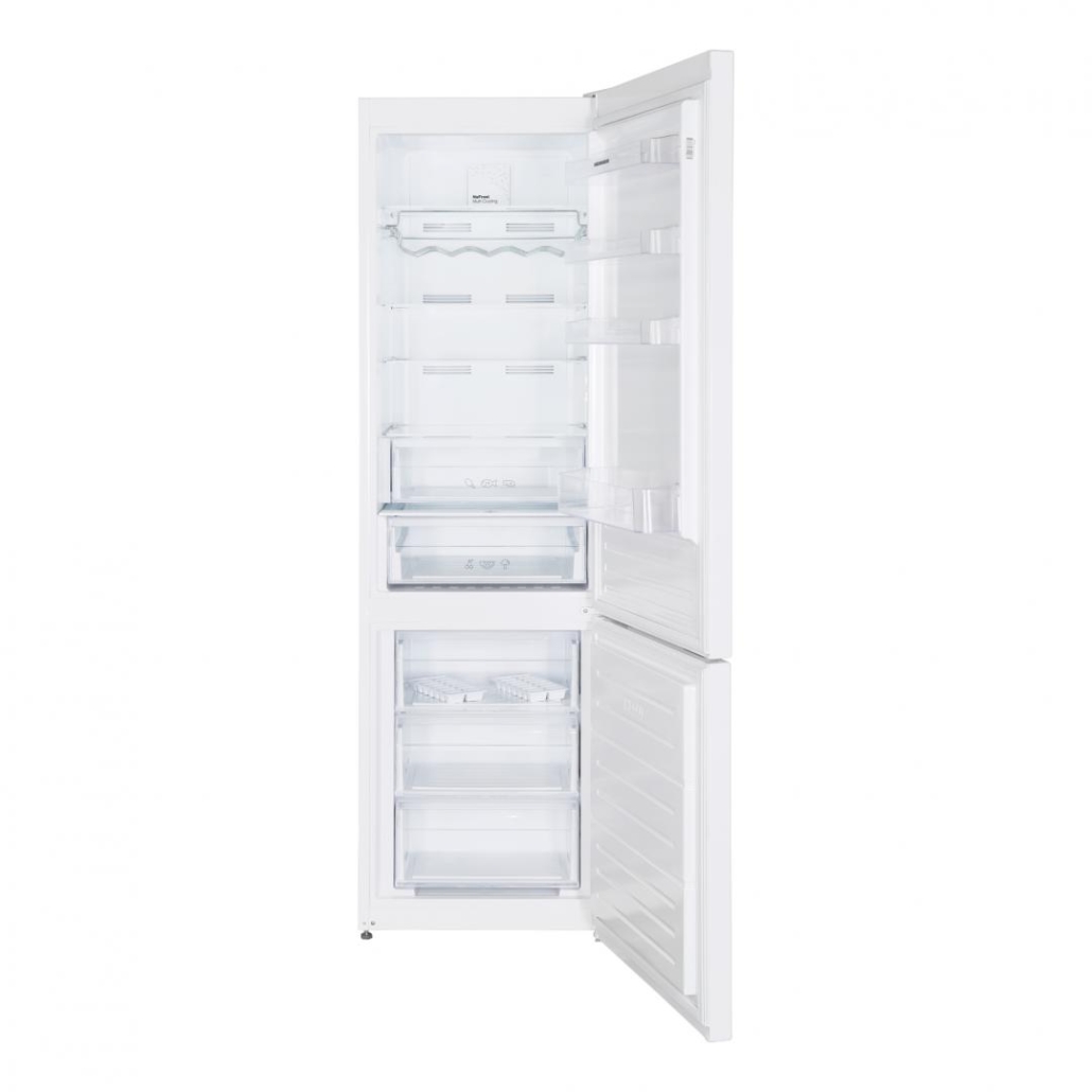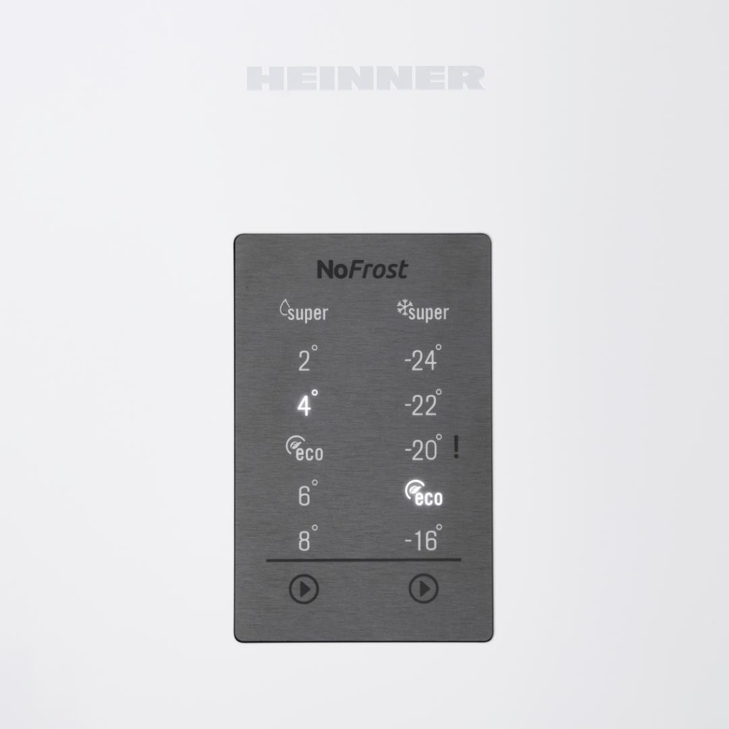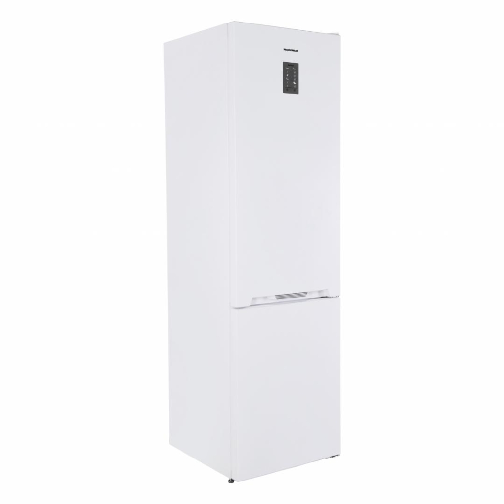 Combi fridge Heinner HCNF-V366E++, No Frost Multicooling, energy efficiency class: E, total capacity: 366 L, fridge capacity: 265 L, freezer capacity: 101 L, display on door, electronic control, Freezer Shield technology, LED light, Super freezing function, open door alarm, Chiller drawer, crisper drawer with humidity control, 3 fridge glass shelves, 3 freezer drawers, egg tray, ice cube tray, freezing capacity: 8kg/24h, dimensions (WxDxH): 59.5 x 65 x 201cm, color: white with chromed strip decoration on handle