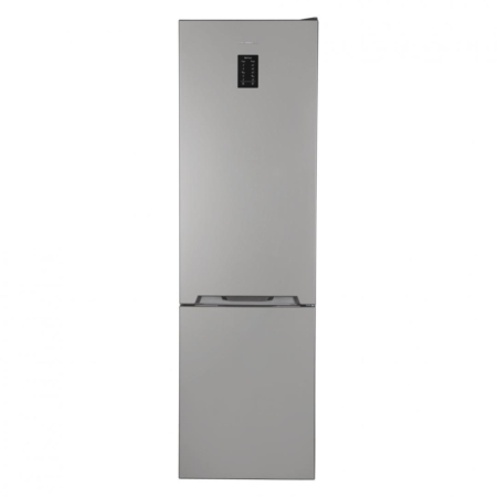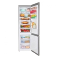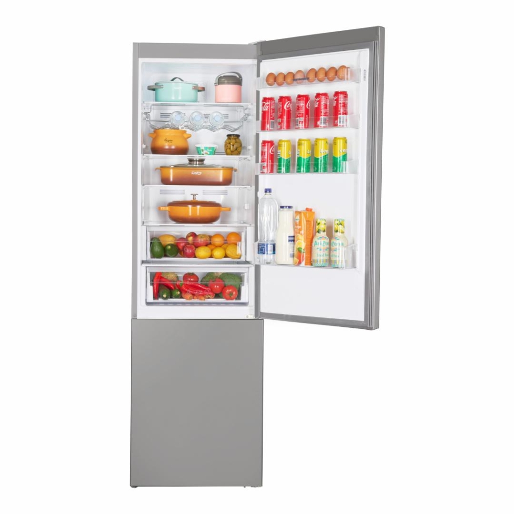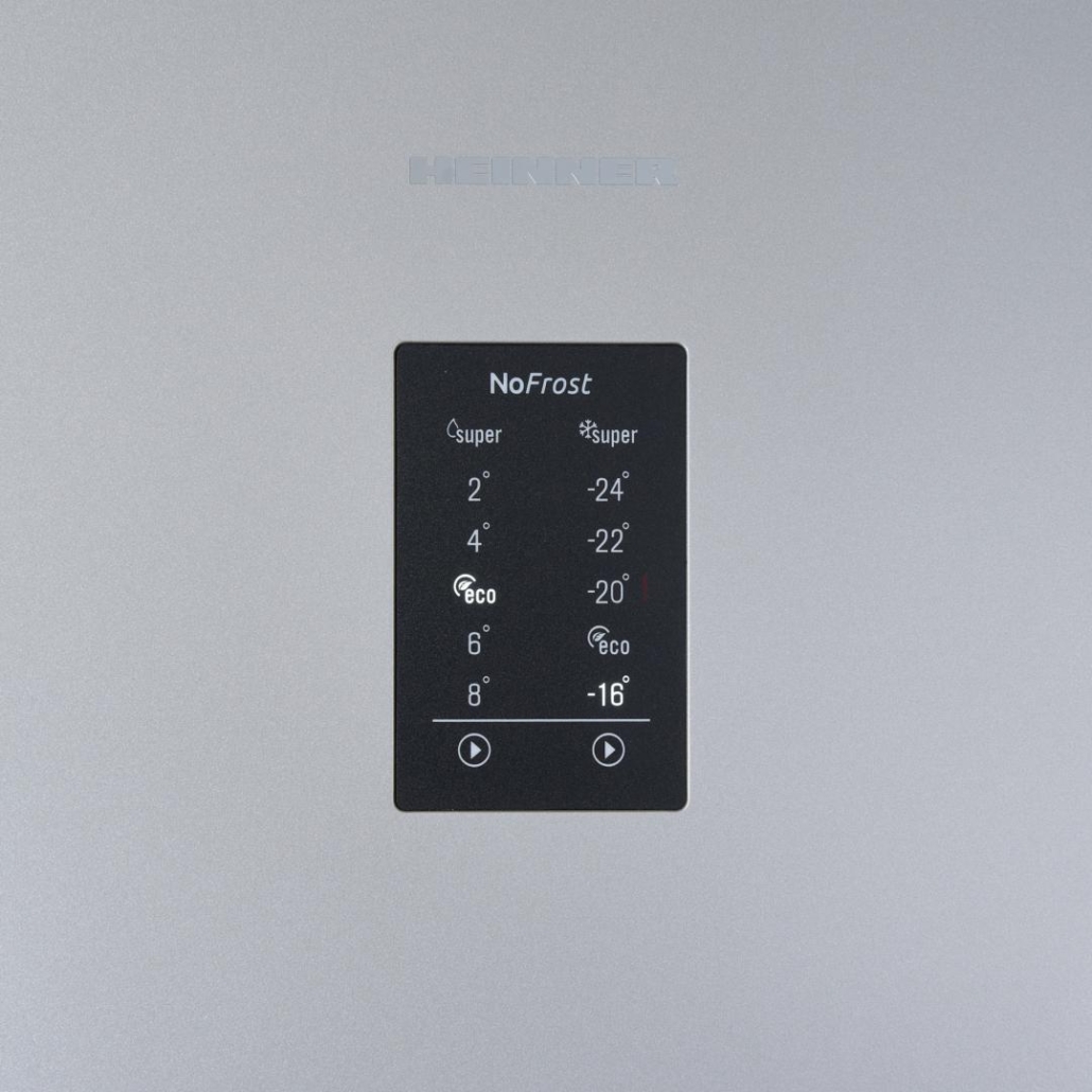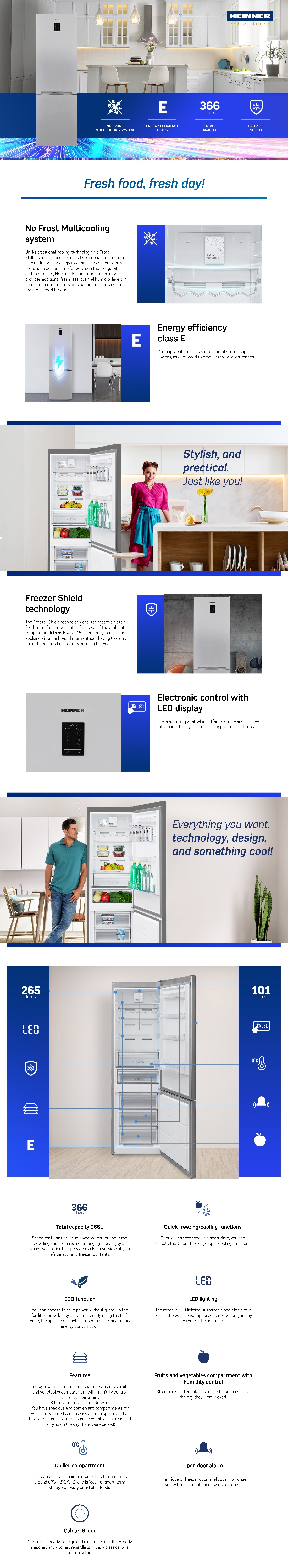 Combi fridge Heinner HCNF-V366SE++, No Frost Multicooling, energy efficiency class: E, total capacity: 366 L, fridge capacity: 265 L, freezer capacity: 101 L, display on door, electronic control, Freezer Shield technology, LED light, Super freezing function, open door alarm, Chiller drawer, crisper drawer with humidity control, 3 fridge glass shelves, 3 freezer drawers, egg tray, ice cube tray, freezing capacity: 8kg/24h, dimensions (WxDxH): 59.5 x 65 x 201cm, color: silver with chromed strip decoration on handle