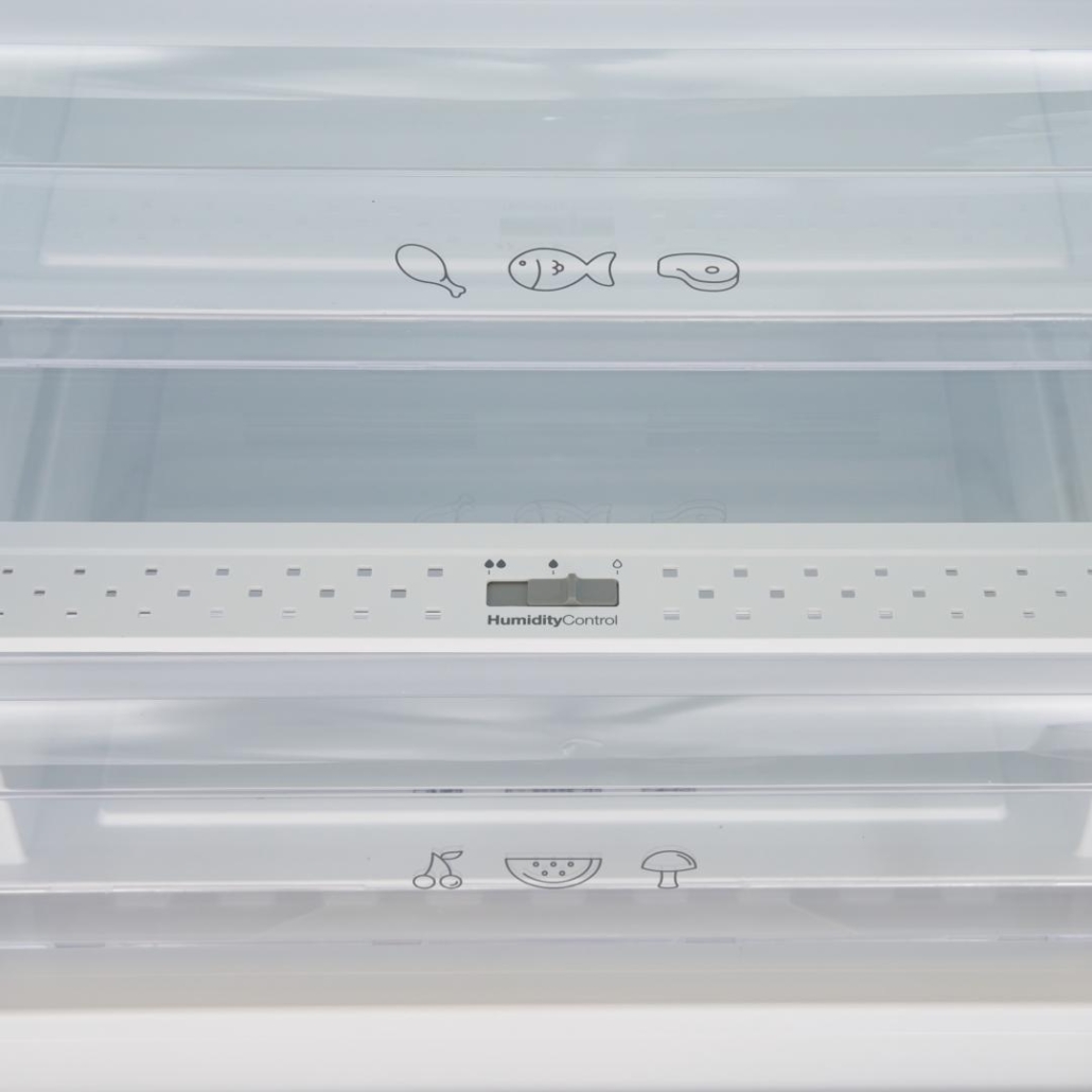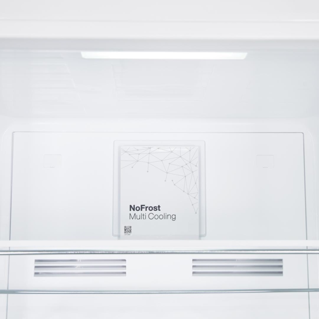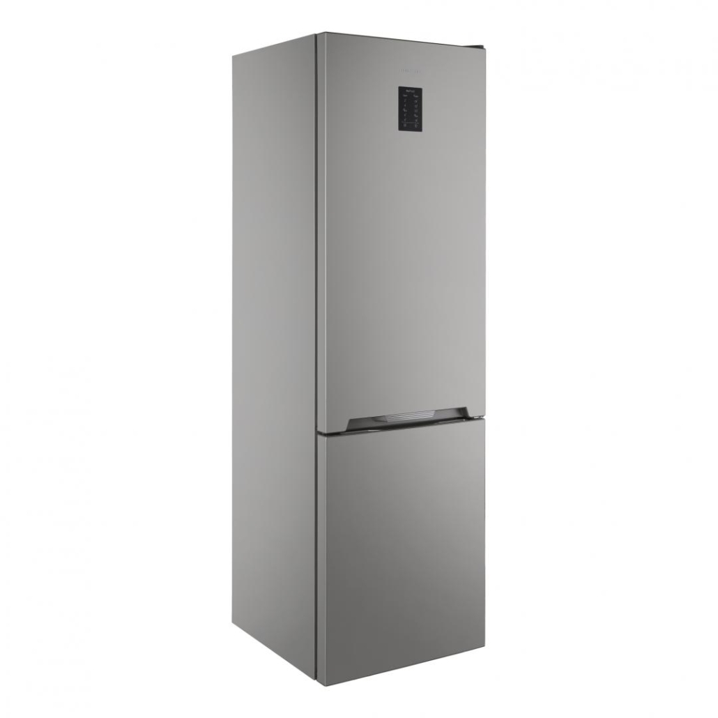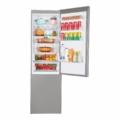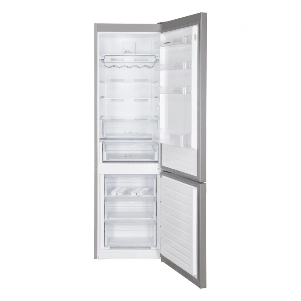 Combi fridge Heinner HCNF-V366SE++, No Frost Multicooling, energy efficiency class: E, total capacity: 366 L, fridge capacity: 265 L, freezer capacity: 101 L, display on door, electronic control, Freezer Shield technology, LED light, Super freezing function, open door alarm, Chiller drawer, crisper drawer with humidity control, 3 fridge glass shelves, 3 freezer drawers, egg tray, ice cube tray, freezing capacity: 8kg/24h, dimensions (WxDxH): 59.5 x 65 x 201cm, color: silver with chromed strip decoration on handle