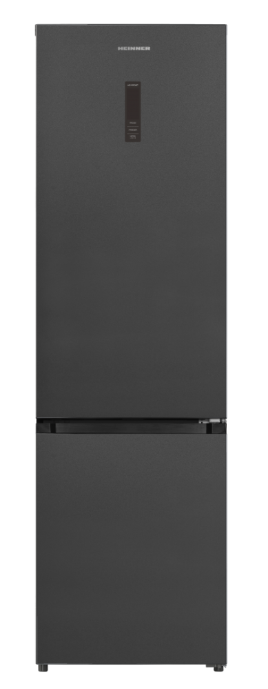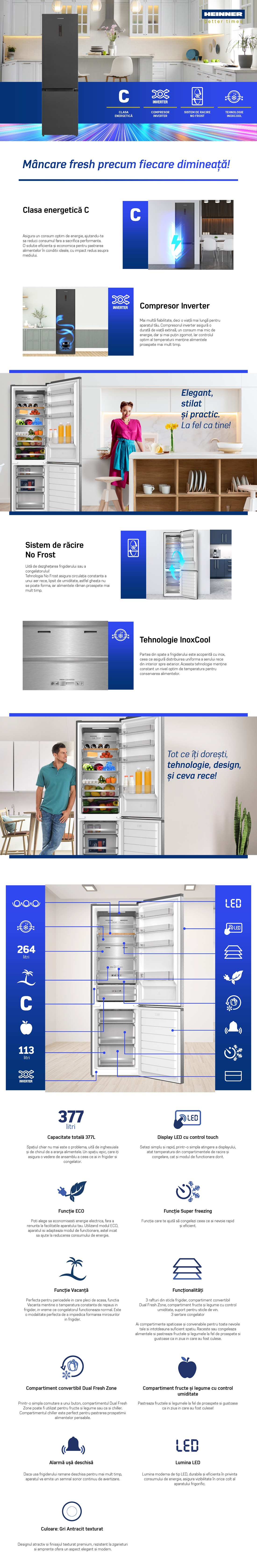Combi fridge Heinner HCNF-HM377INVDGHC, No Frost, Inverter compressor, energy efficiency class: C, total capacity: 377 L, refrigerator capacity: 264 L, freezer capacity: 113 L, electronical control, InoxCool technology, LED light, ECO function, Holiday function, Super function, 3 fridge glass shelves, wooden shelf for bottles, convertible compartment, fruit and vegetable compartment with humidity control, 3 freezer drawers, egg tray, ice cube tray, freezing capacity: 10kg/24h, dimensions (WxDxH): 60 x 67.5 x 200.5 cm, color: Anthracite grey textured door