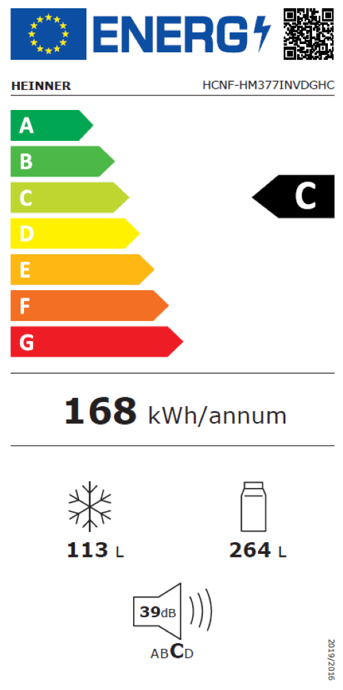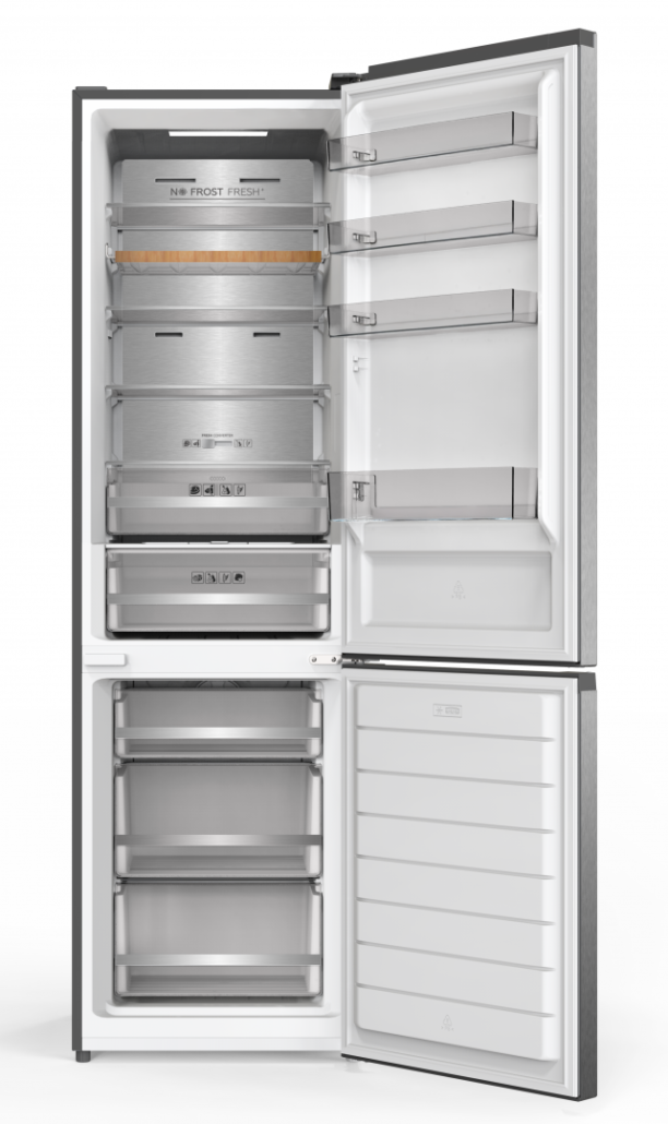 Combi fridge Heinner HCNF-HM377INVDGHC, No Frost, Inverter compressor, energy efficiency class: C, total capacity: 377 L, refrigerator capacity: 264 L, freezer capacity: 113 L, electronical control, InoxCool technology, LED light, ECO function, Holiday function, Super function, 3 fridge glass shelves, wooden shelf for bottles, convertible compartment, fruit and vegetable compartment with humidity control, 3 freezer drawers, egg tray, ice cube tray, freezing capacity: 10kg/24h, dimensions (WxDxH): 60 x 67.5 x 200.5 cm, color: Anthracite grey textured door