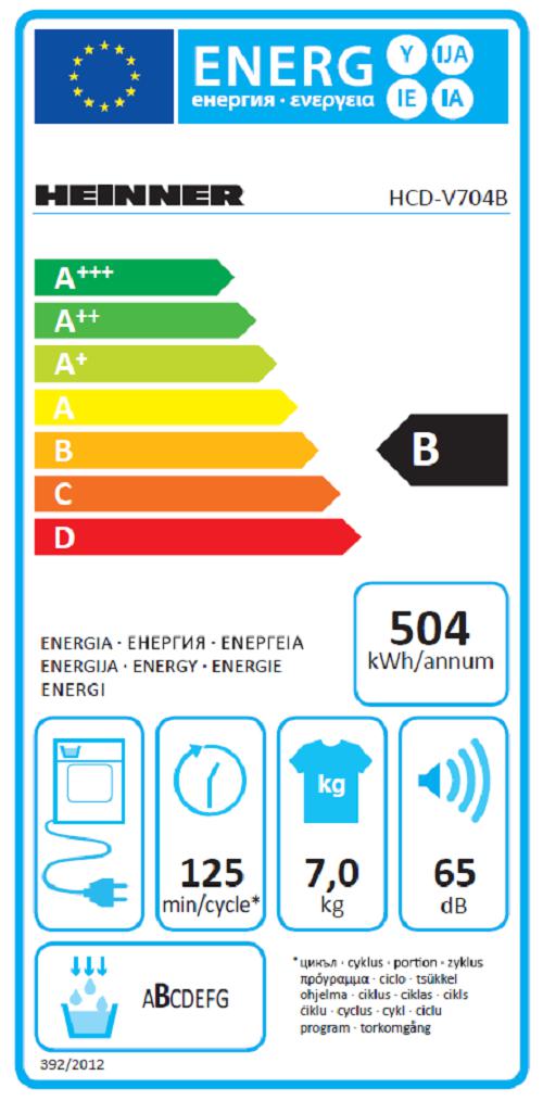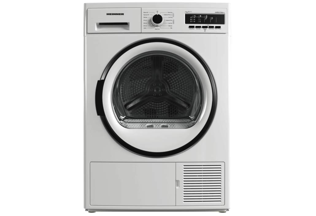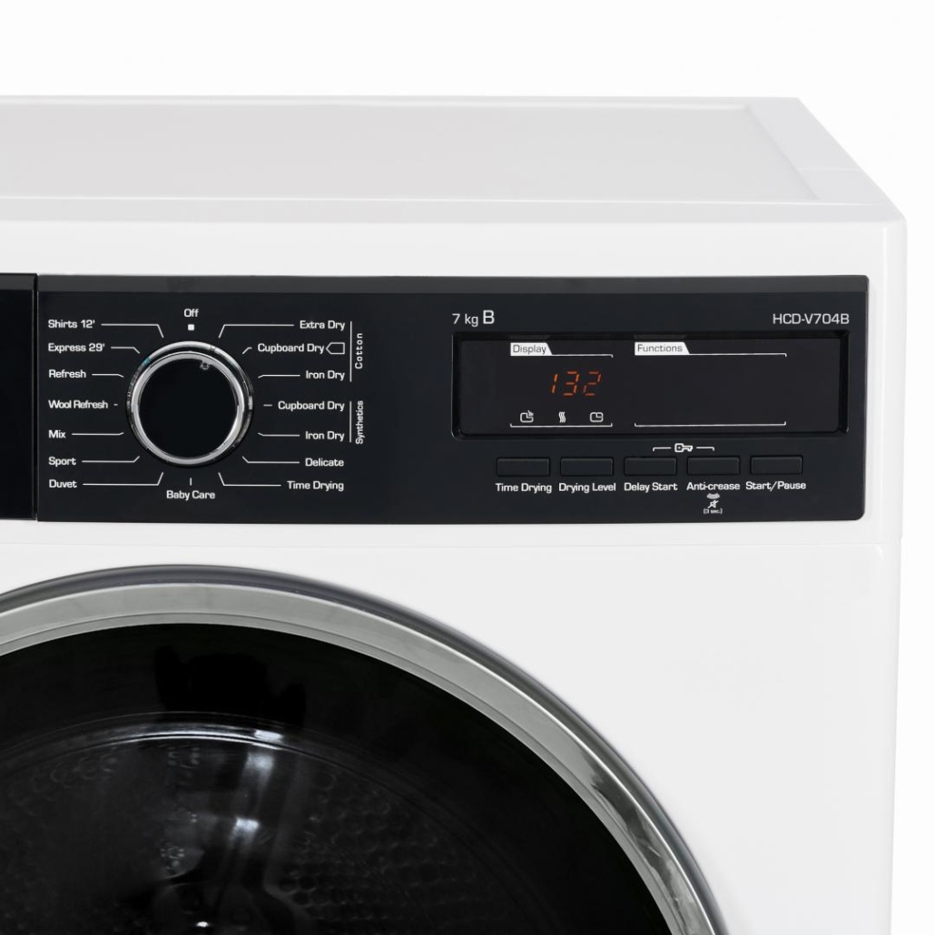 Condenser dryer Heinner HCD-V704B, Loading capacity 7kg, Energy efficiency class B, 15 drying programs, Elegant design with black panel and chromed door, LED display, Shirts 12 min, Expres 29 min, Baby care program, Delay start, Anti-crease function, Drum light, Drying level selection, Lint filter indicator, Water tank full indicator, Child lock, Dimensions (WxDxH): 59.6x56.3x84.5 cm, Color: White