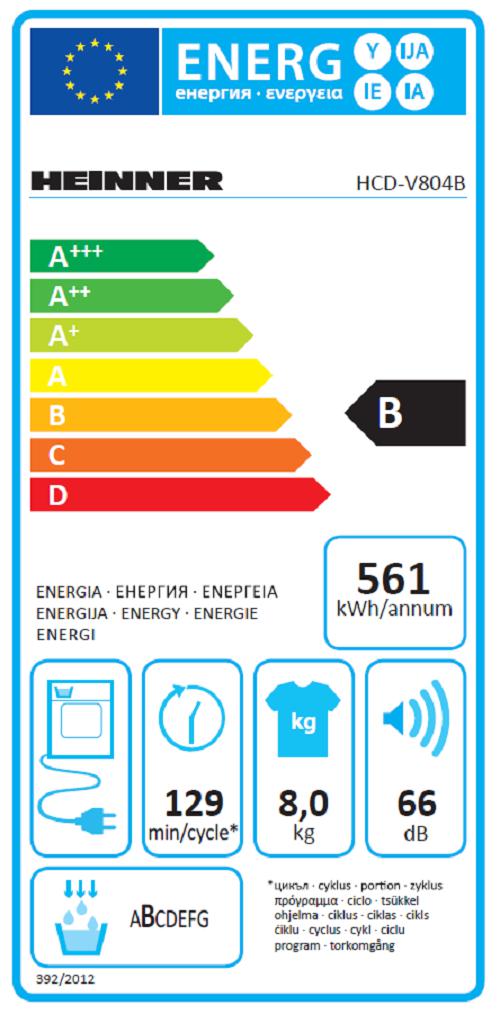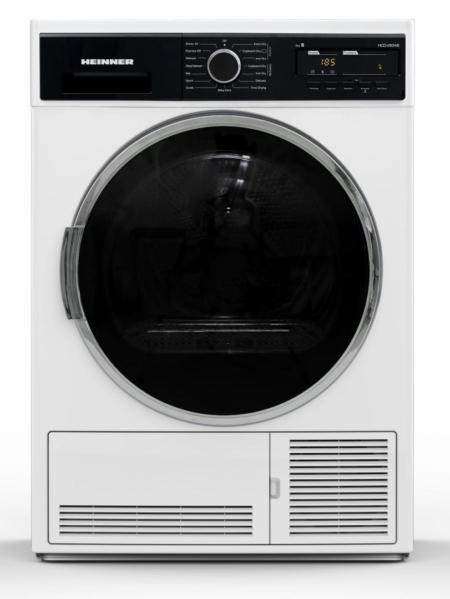 Condenser dryer Heinner HCD-V804B, Loading capacity 8kg, Energy efficiency class B, 15 drying programs, Elegant design with black panel and chromed door, LED display, Shirts 12 min, Expres 29 min, Baby care program, Delay start, Anti-crease function, Drum light, Drying level selection, Lint filter indicator, Water tank full indicator, Child lock, Dimensions (WxDxH): 59.6x60.9x84.5 cm, Color: White