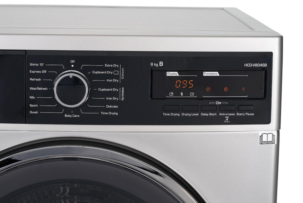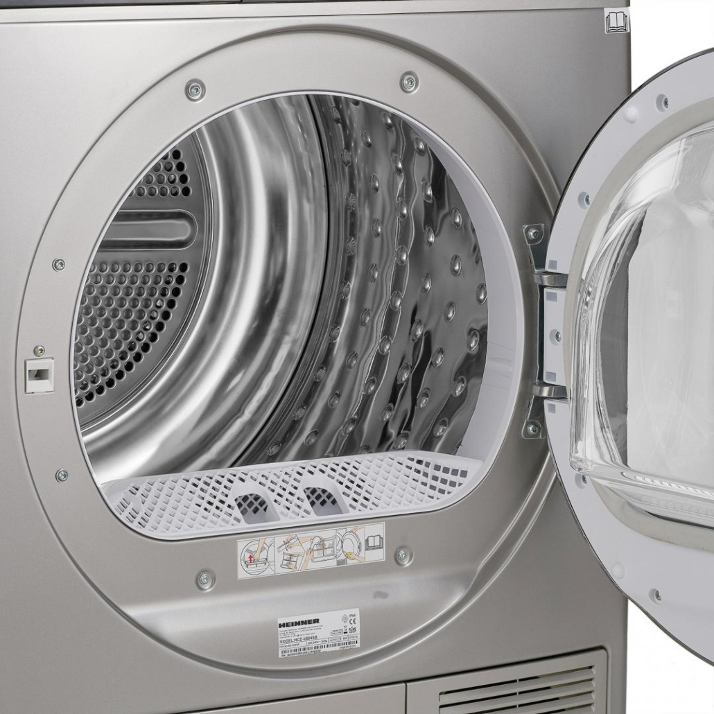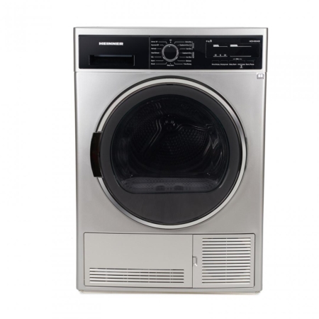 Condenser dryer Heinner HCD-V804SB, Loading capacity 8kg, Energy efficiency class B, 15 drying programs, Elegant design with black panel and chromed door, LED display, Shirts 12 min, Expres 29 min, Baby care program, Delay start, Anti-crease function, Drum light, Drying level selection, Lint filter indicator, Water tank full indicator, Child lock, Dimensions (WxDxH): 59.6x60.9x84.5 cm, Color: Silver