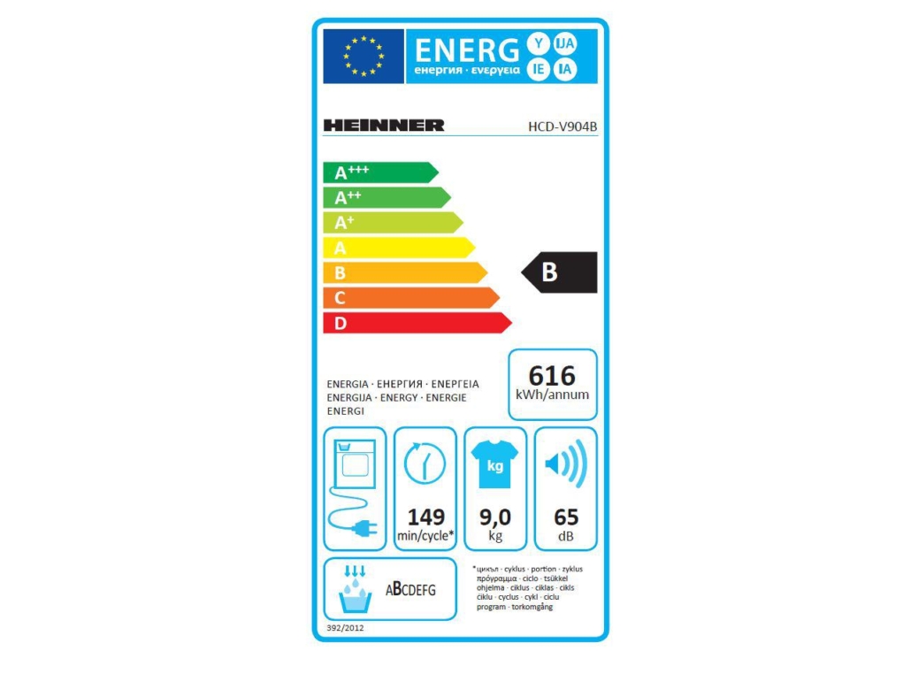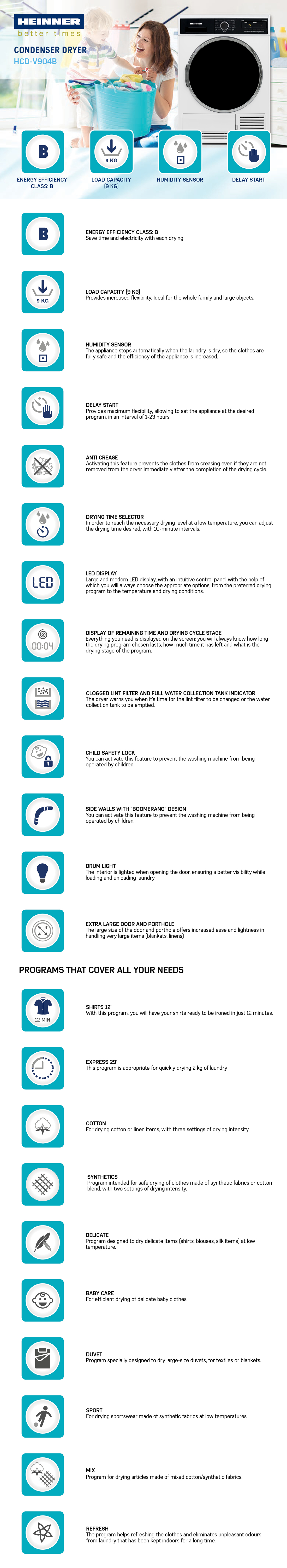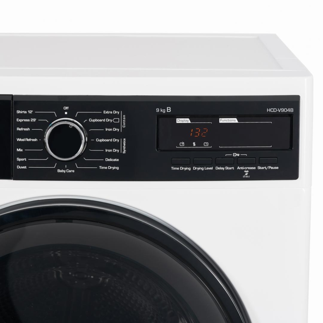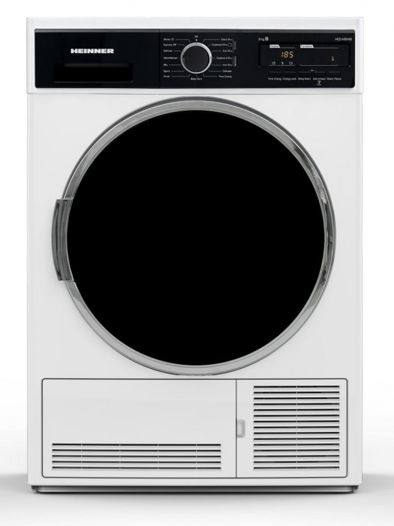 Condenser dryer Heinner HCD-V904B, Loading capacity 9kg, Energy efficiency class B, 15 drying programs, Elegant design with black panel and chromed door, LED display, Shirts 12 min, Expres 29 min, Baby care program, Delay start, Anti-crease function, Drum light, Drying level selection, Lint filter indicator, Water tank full indicator, Child lock, Dimensions (WxDxH): 59.6x60.9x84.5 cm, Color: White