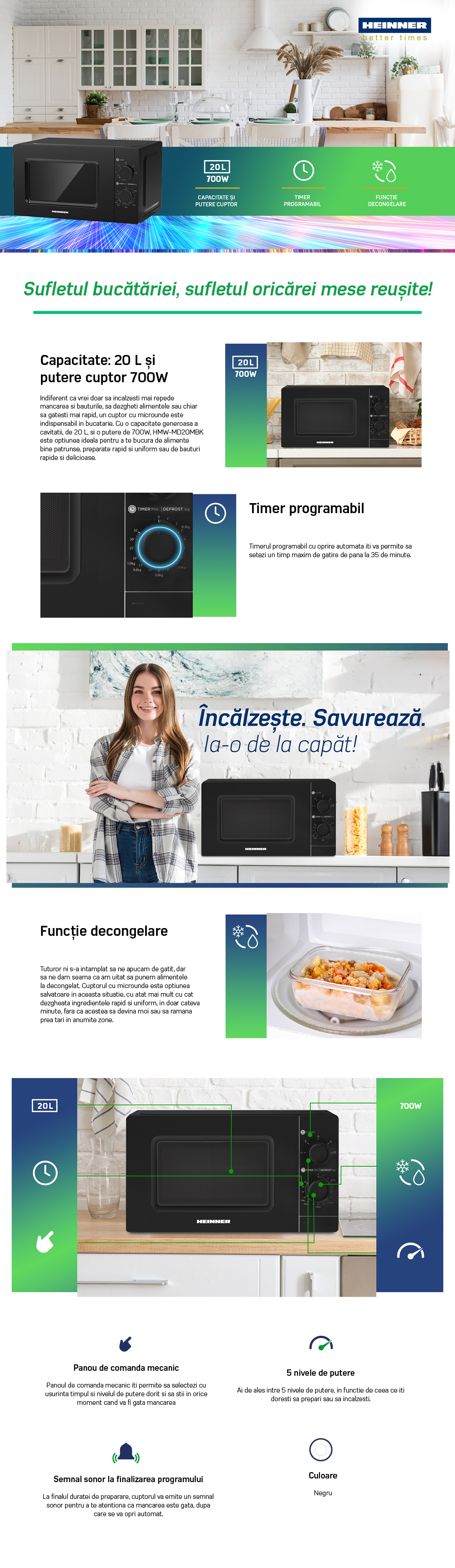 CUPTOR CU MICROUNDE HEINNER HMW-MD20MBK, CAPACITATE 20L, CONTROL MECANIC, PUTERE CUPTOR 700W, 5 TREPTE DE PUTERE, TIMER, TIMP MAXIM DE GATIRE 35 MIN, FUNCTIE DECONGELARE, DIAMETRU PLATOU ROTATIV 255MM, DIMENSIUNI ( LXAXI): 44X33.6X25.9 CM, CULOARE: NEGRU