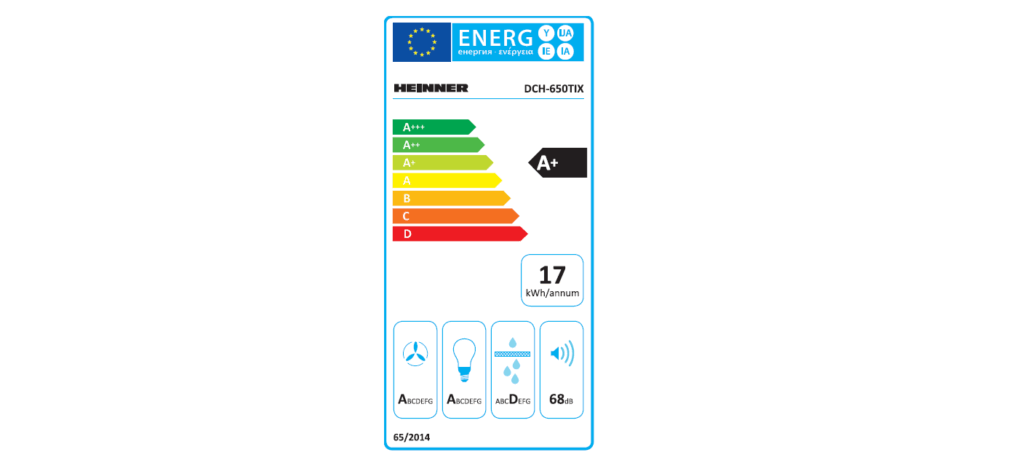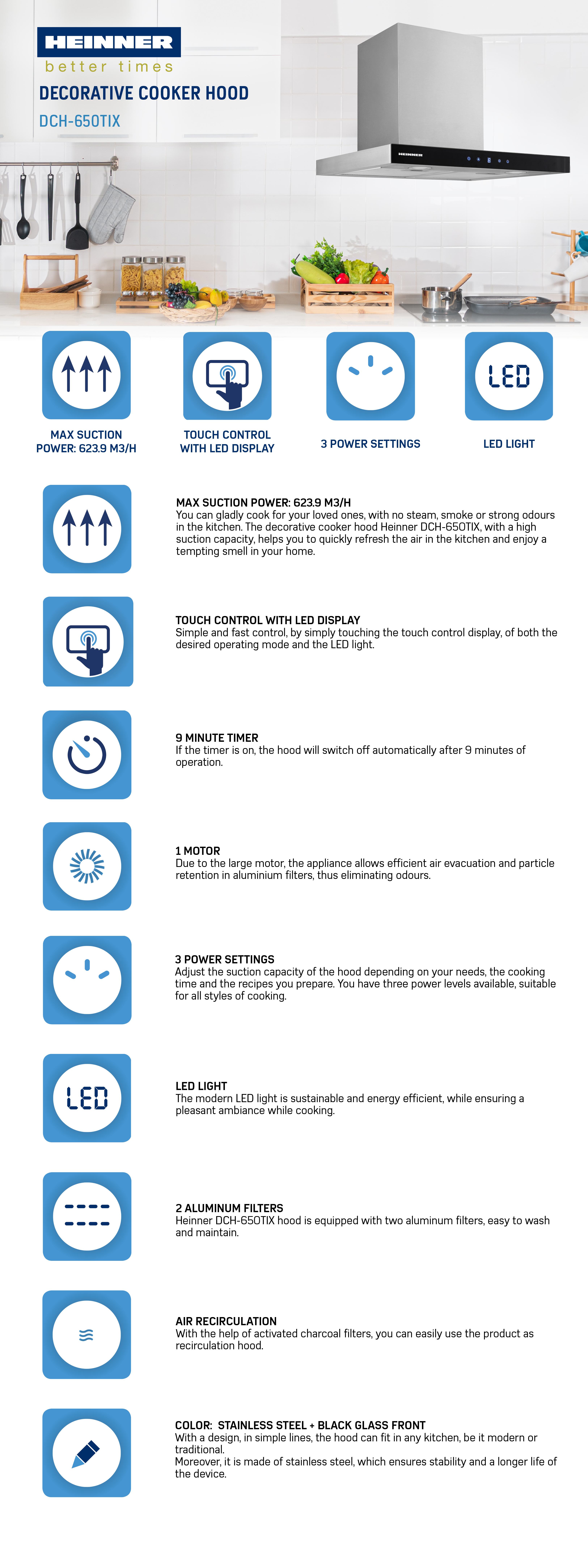 Decorative cooker hood Heinner DCH-650TIX, Max suction power: 623.9 m³/h, 3 power levels, Motor: 1 x 190W, LED light: 2 x 1.5W, 2 aluminum filters, Touch control, Air outlet diameter: 150mm, Dimensions (WxDxH): 60x50.5x(45-83) cm, Color: Stainless steel + black glass
