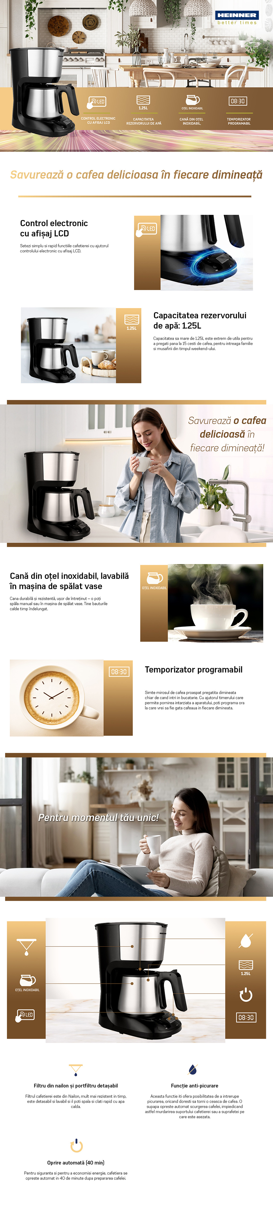 Digital coffee maker Heinner Armoure HCM-D750SSBK, digital control, LCD display, water tank capacity: 1,25 L, stainless steel jug, detachable filters, timer, dry-run protection, auto-off (40 min.), power: 750W