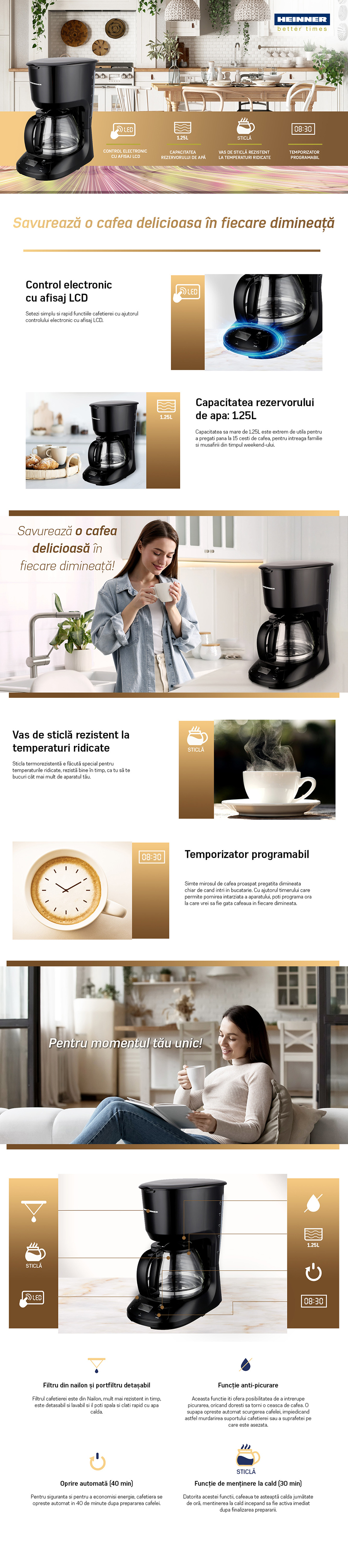 DIGITAL COFFEE MAKER HEINNER BLACK CHATT HCM-D750GCBK, 750W, 1.25L WATER TANK CAPACITY, DIGITAL CONTROL, LCD DISPLAY, DETACHABLE FILTERS, NYLON FILTER, HEAT RESISTANT GLASS JUG, TIMER, RUN-DRY PROTECTION, AUTO-OFF 40 MIN, BLACK