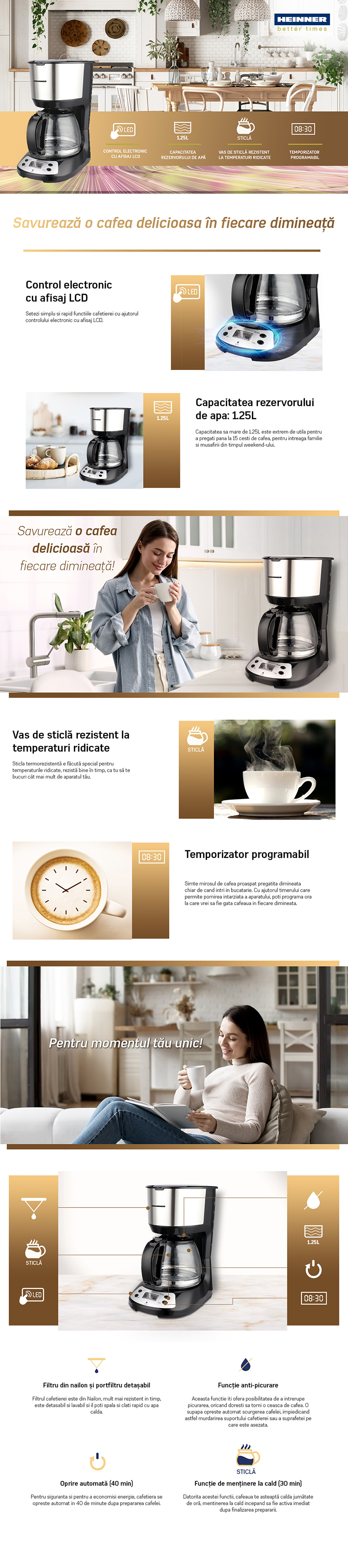 DIGITAL COFFEE MAKER HEINNER SILVER CHATT HCM-D750GCSS, 750W, 1.25L TANK CAPACITY, DIGITAL CONTROL, LCD DISPLAY, DETACHABLE FILTER, HEAT REZISTANT GLASS JUG, TIMER, ANTI-DROP FUNCTION, AUTO-OFF 40 MIN, KEPP-WARM FUNCTION 30 MIN, COLOR: BLACK WITH STAINLESS STEEL INSERTS
