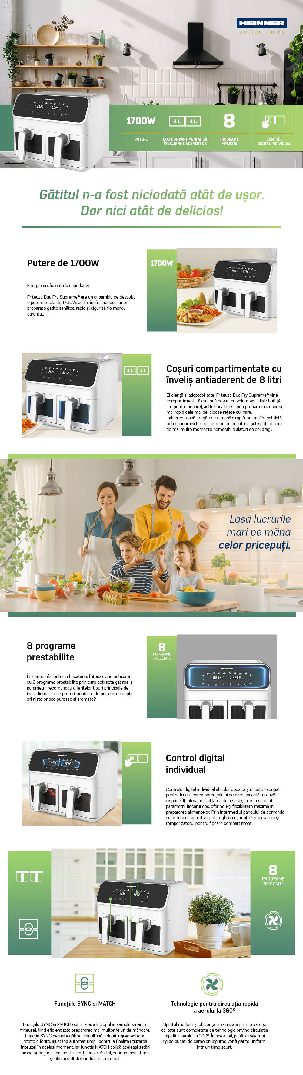 DOUBLE AIR FRYER HEINNER HAF-H8DBWH17, 1700W, TOTAL CAPACITY: 8L, DIGITAL DISPLAY & TOUCH CONTROL, INDIVIDUAL CONTROL , 8 PRESET PROGRAMS, TEMPERATURE 80-200 GRADES, SYNC & MATCH FUNCTION, SEE-THROUGH WINDOWS, AUTO-OFF, NON-STICK COATING, WHITE