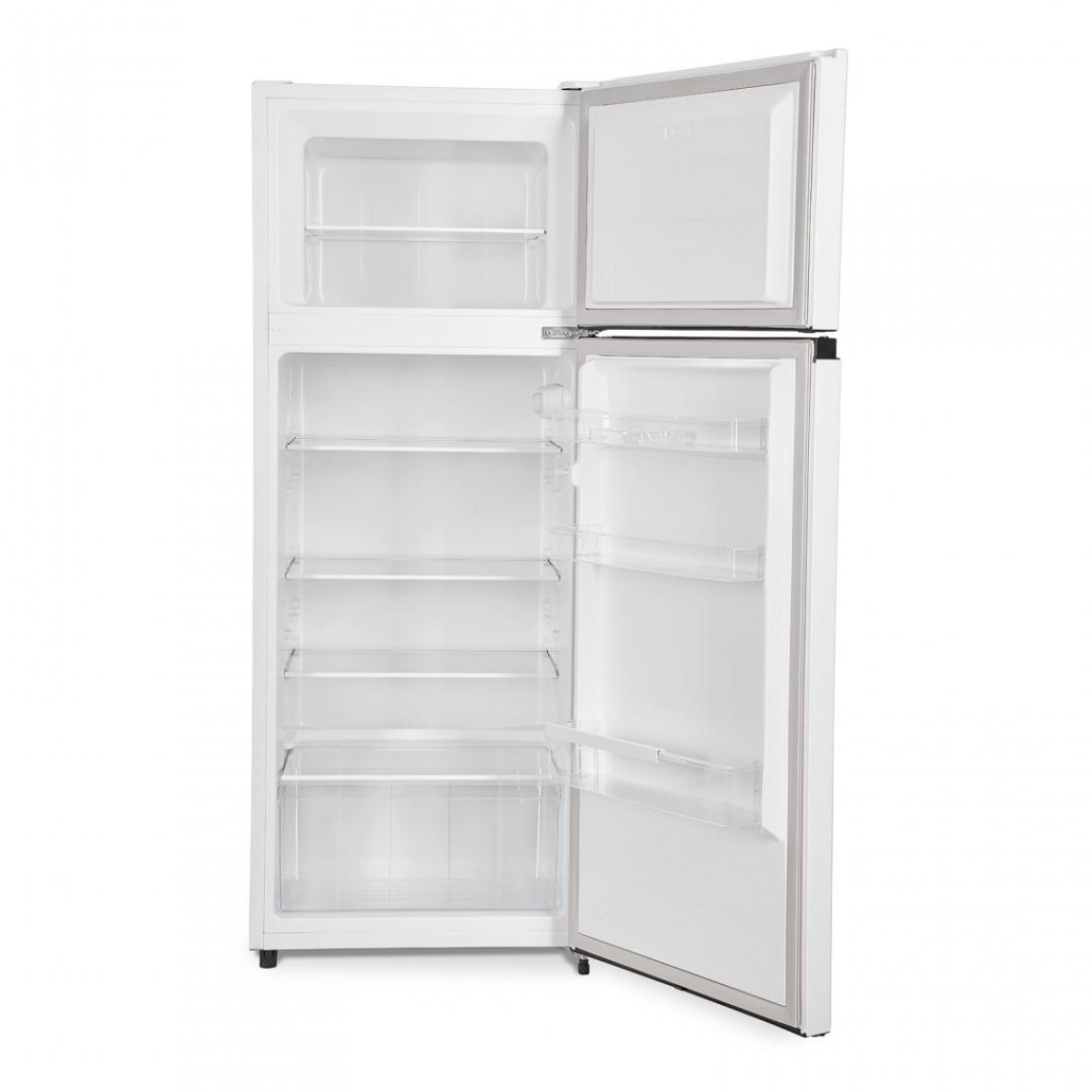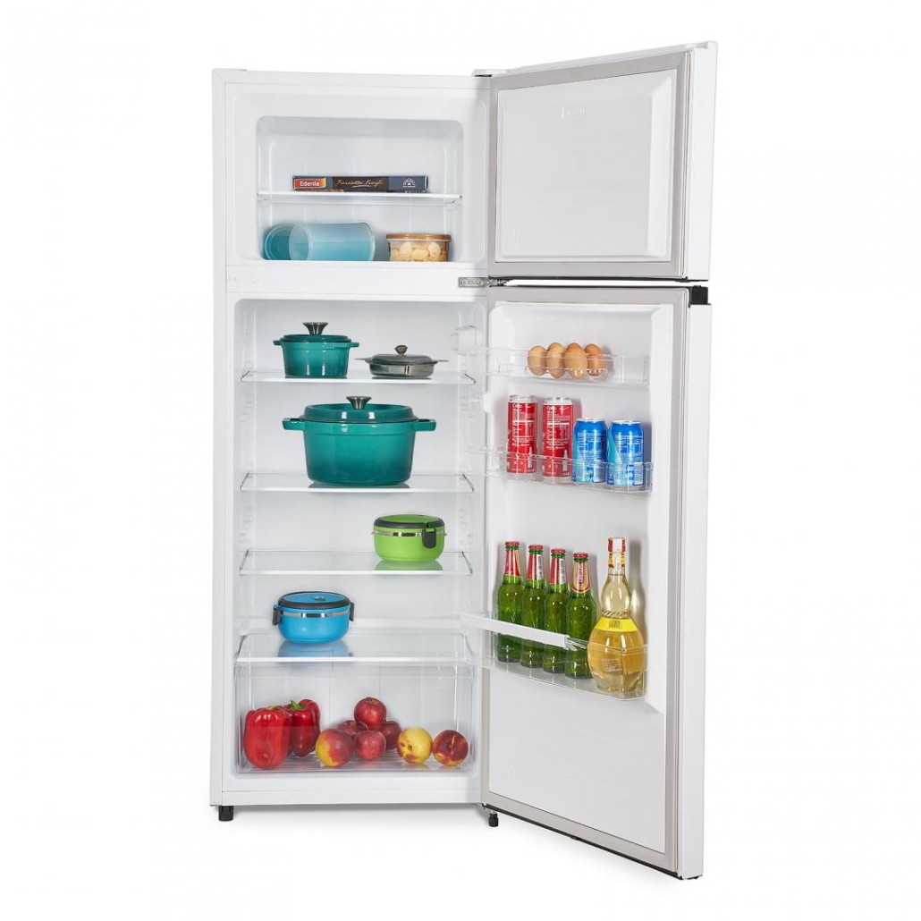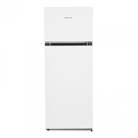 Double door refrigerator Heinner HF-205F+, Energy efficiency class: F, Total capacity: 206L, Fridge capacity: 165L, Freezer capacity: 41L, Mechanical control with adjustable thermotstat, LED light, 3 fridge glass shelves, 1 compartment for fruits and vegetables, Reversible doors, Egg tray, Ice cube tray, Freezing capacity: 2Kg/24h, Dimensions (WxDxH): 55 x 54.2 × 143.4 cm