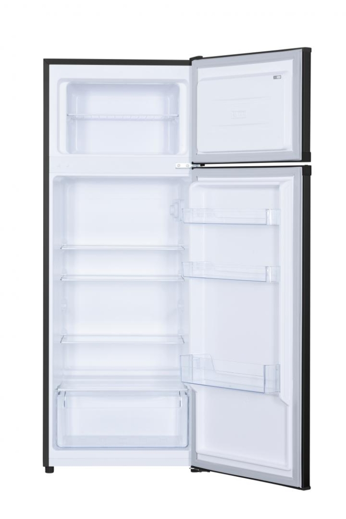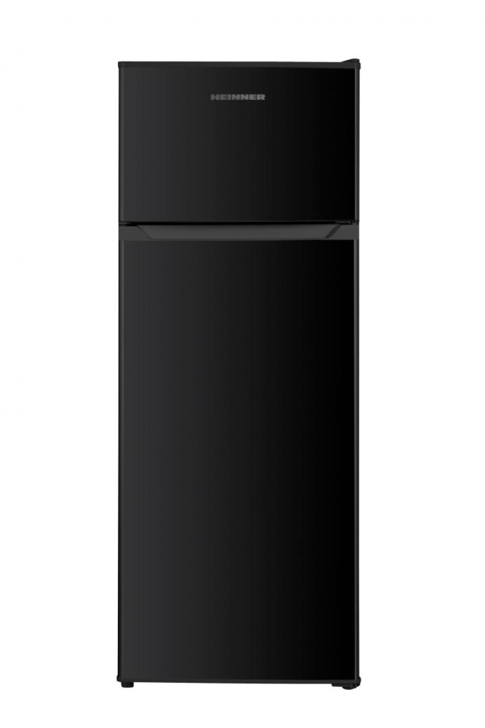 Double door refrigerator Heinner HF-H2206BKE++, energy efficiency class: E, total capacity: 206L, fridge capacity: 169L, freezer capacity: 37L, mechanical control with adjustable thermostat, LED light, 3 fridge glass shelves, 1 compartment for fruits and vegetables, reversible doors, egg tray, freezing capacity: 2.4kg/24h, dimensions (WxDxH): 54.5 x 55.5 x 143 cm, color: Black