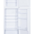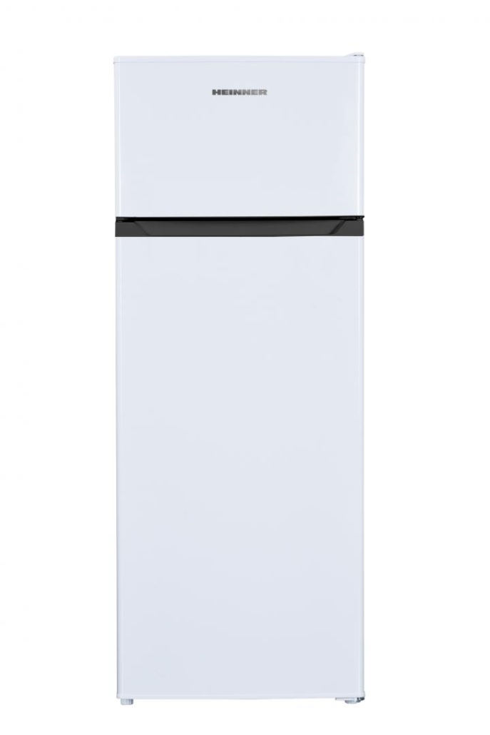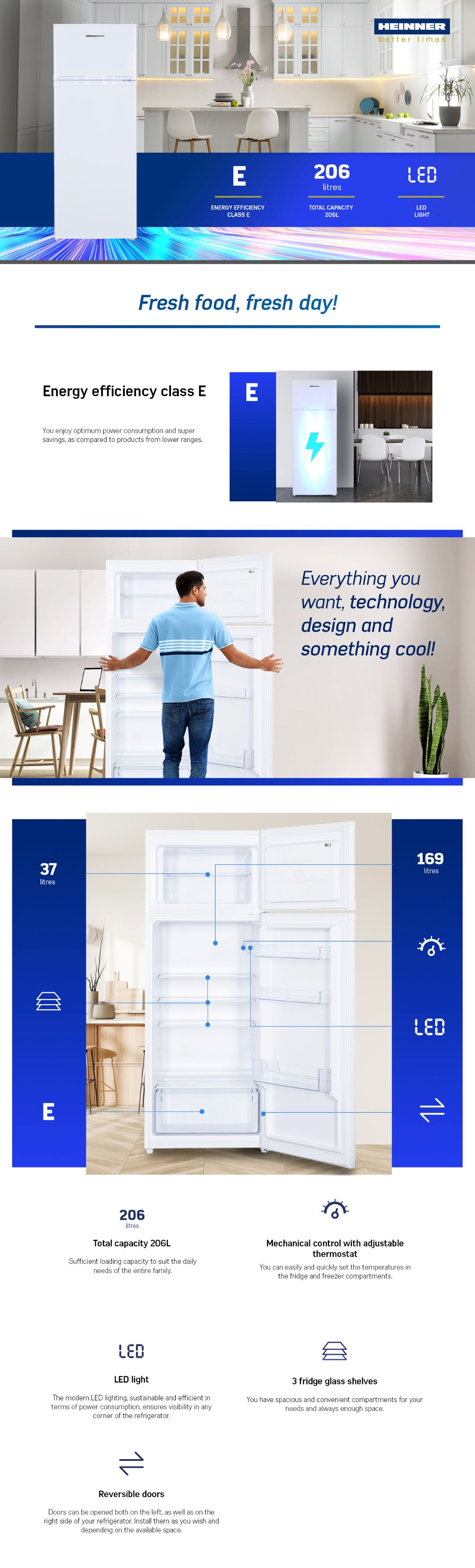 Double door refrigerator Heinner HF-H2206E++, energy efficiency class: E, total capacity: 206L, fridge capacity: 169L, freezer capacity: 37L, mechanical control with adjustable thermostat, LED light, 3 fridge glass shelves, 1 compartment for fruits and vegetables, reversible doors, egg tray, freezing capacity: 2.4kg/24h, dimensions (WxDxH): 54.5 x 55.5 x 143 cm, color: White