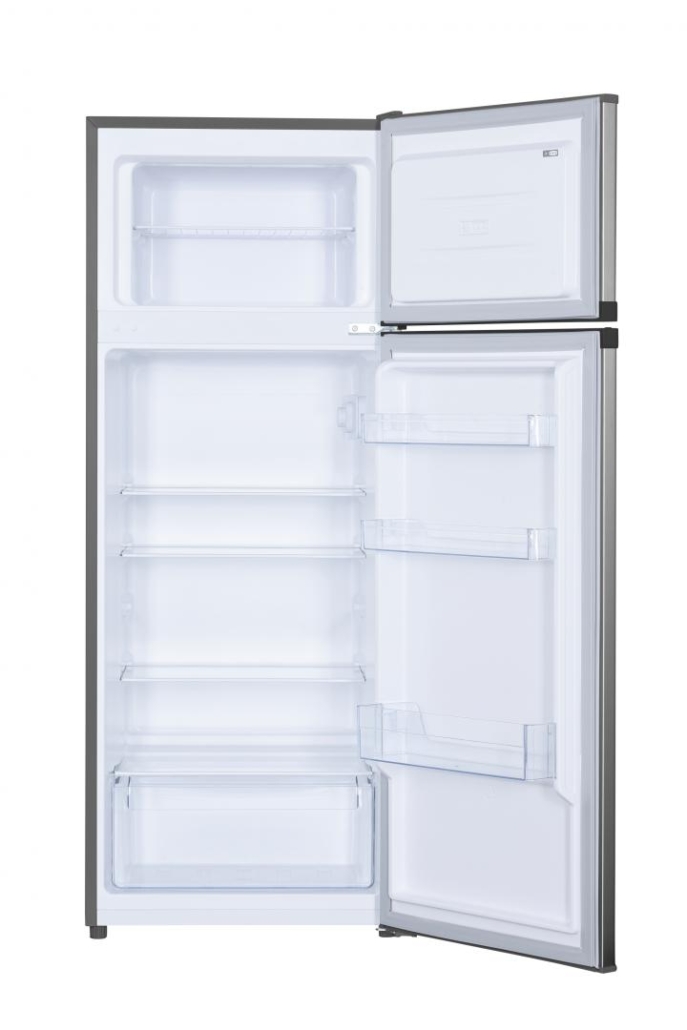 Double door refrigerator Heinner HF-HM2206INVXD, energy efficiency class: D, Inverter compressor, total capacity: 206L, fridge capacity: 169L, freezer capacity: 37L, mechanical control with adjustable thermostat, LED light, 3 fridge glass shelves, 1 compartment for fruits and vegetables, reversible doors, egg tray, freezing capacity: 2.4kg/24h, dimensions (WxDxH): 54.5 x 55.5 x 143 cm, color: Inox look