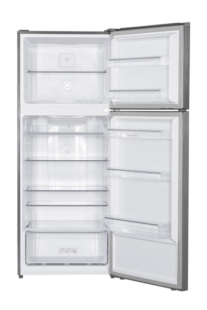 Double door refrigerator Heinner HF-HM415NFINVSD, Full No Frost, energy efficiency class: D, Inverter compressor, total capacity: 415L, fridge capacity: 321L, freezer capacity: 94L, LED display with touch control, Power cool function, fridge compartment: 3 glass shelves, compartment for fruits and vegetables with humidity control, chiller compartment; freezer compartment: 1 glass shelf, LED light, child lock, reversible doors, freezing capacity: 4.4kg/24h, dimensions (WxDxH): 71 x 68.5 x 178 cm, color: Silver