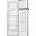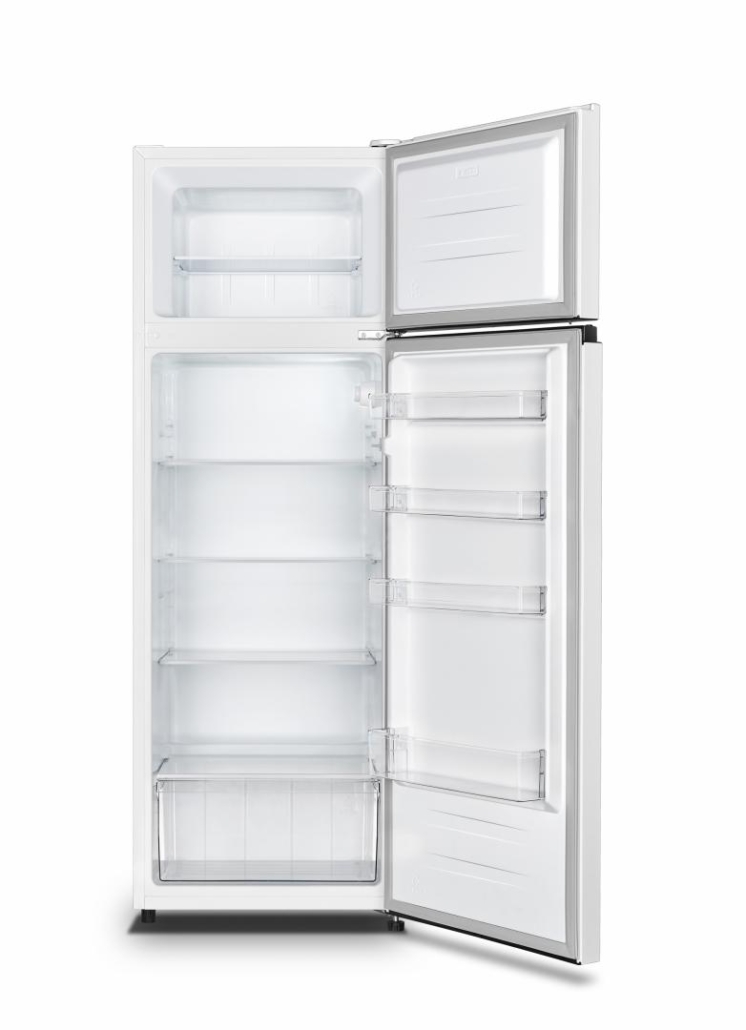 Double door refrigerator Heinner HF-HS243E++, energy efficiency class: E, total capacity: 243L, fridge capacity: 202L, freezer capacity: 41L, mechanical control with adjustable thermostat, LED light, 3 fridge glass shelves, compartment for fruits and vegetables, 3 freezer compartments, reversible doors, egg tray, ice cube tray, freezing capacity: 2 kg/24h, dimensions (WxDxH): 55 x 54.2 x 161 cm, color: White with black handle